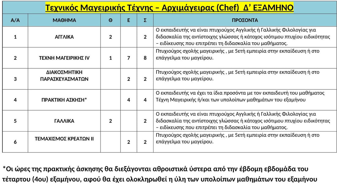 - Πτυχιούχος Σχολής Μαγειρικής, με 5ετή εμπειρία στην εκπαίδευση ή στο επάγγελμα του μαγείρου