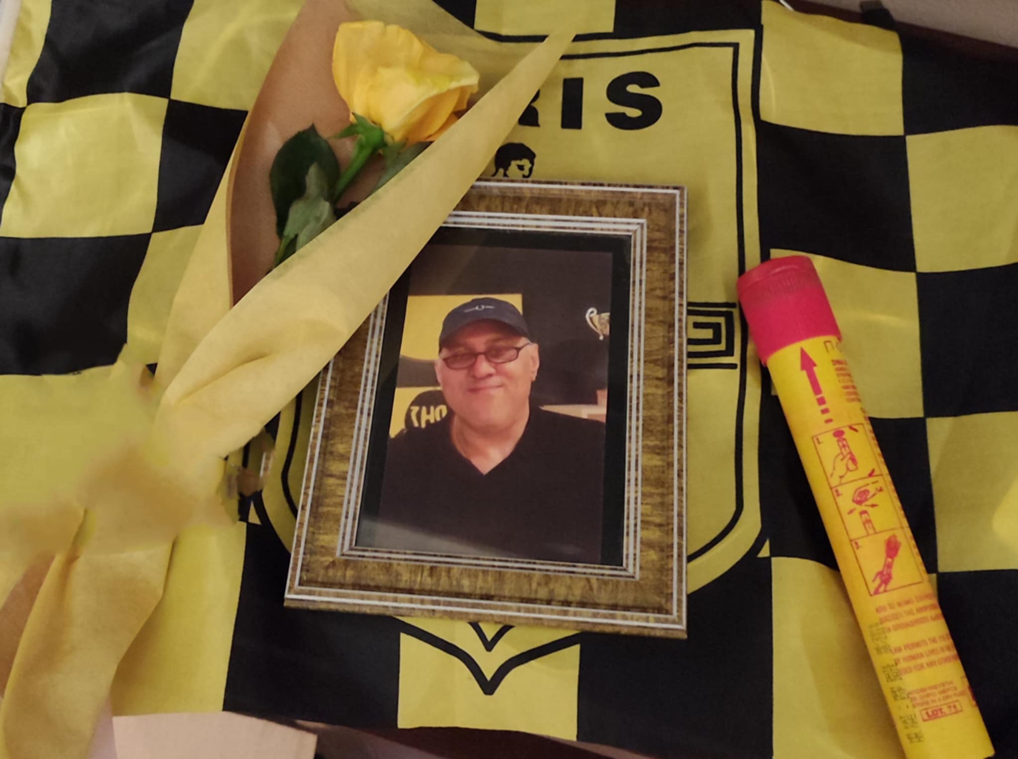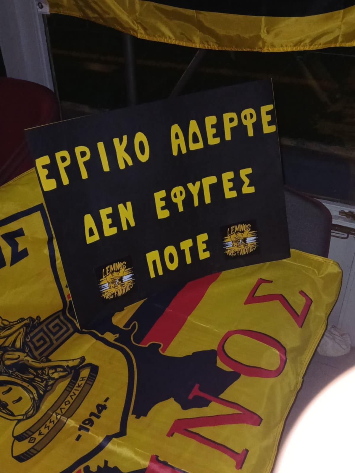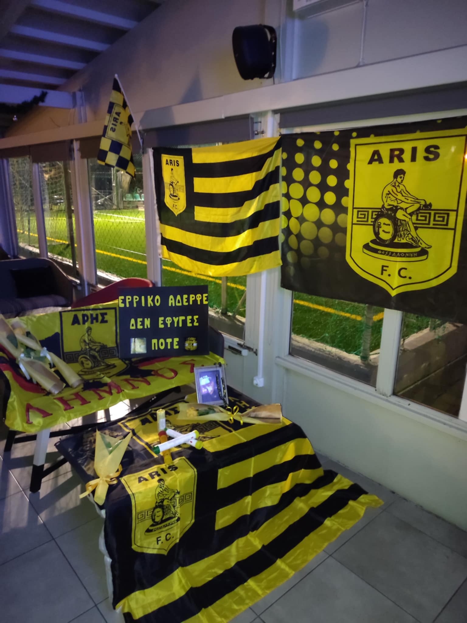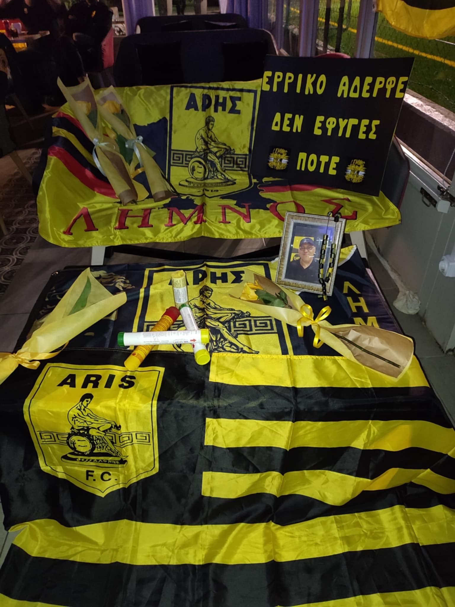 Μετά το τέλος του ματς, που βρήκε νικητή τον Άρη με 2-0, η φωτογραφία του Ερρίκου και η σημαία του με το νησί της Λήμνου, έμειναν στον χώρο κι εκεί θα είναι κάθε που θα παίζει ο Άρης και θα μαζεύεται η κιτρινόμαυρη παρέα!