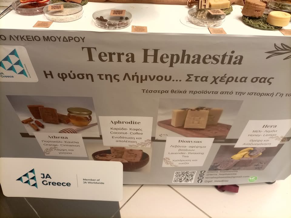 Με πρόκριση στη 2η φάση και μια θέση ανάμεσα στις 10 πρώτες ομάδες της Μαθητικής Εμπορικής Έκθεσης του Junior Achievement Greece στο Mediterranean Cosmos της Θεσσαλονίκης η Terra Hephaestia κέρδισε τις εντυπώσεις. Ποιότητα, καλαισθησία, ευγένεια και αμεσότητα έκαναν το περίπτερο 36 ξεχωριστό. Η Λήμνος, ιδιαίτερα αγαπητή στη Βόρειο Ελλάδα, προκάλεσε το ενδιαφέρον των επισκεπτών. Αγαπημένοι φίλοι της Λήμνου και του σχολείου μας βρέθηκαν κοντά μας και στήριξαν την προσπάθειά μας.