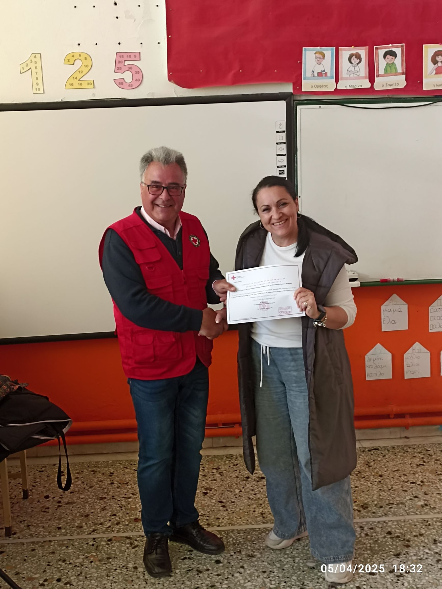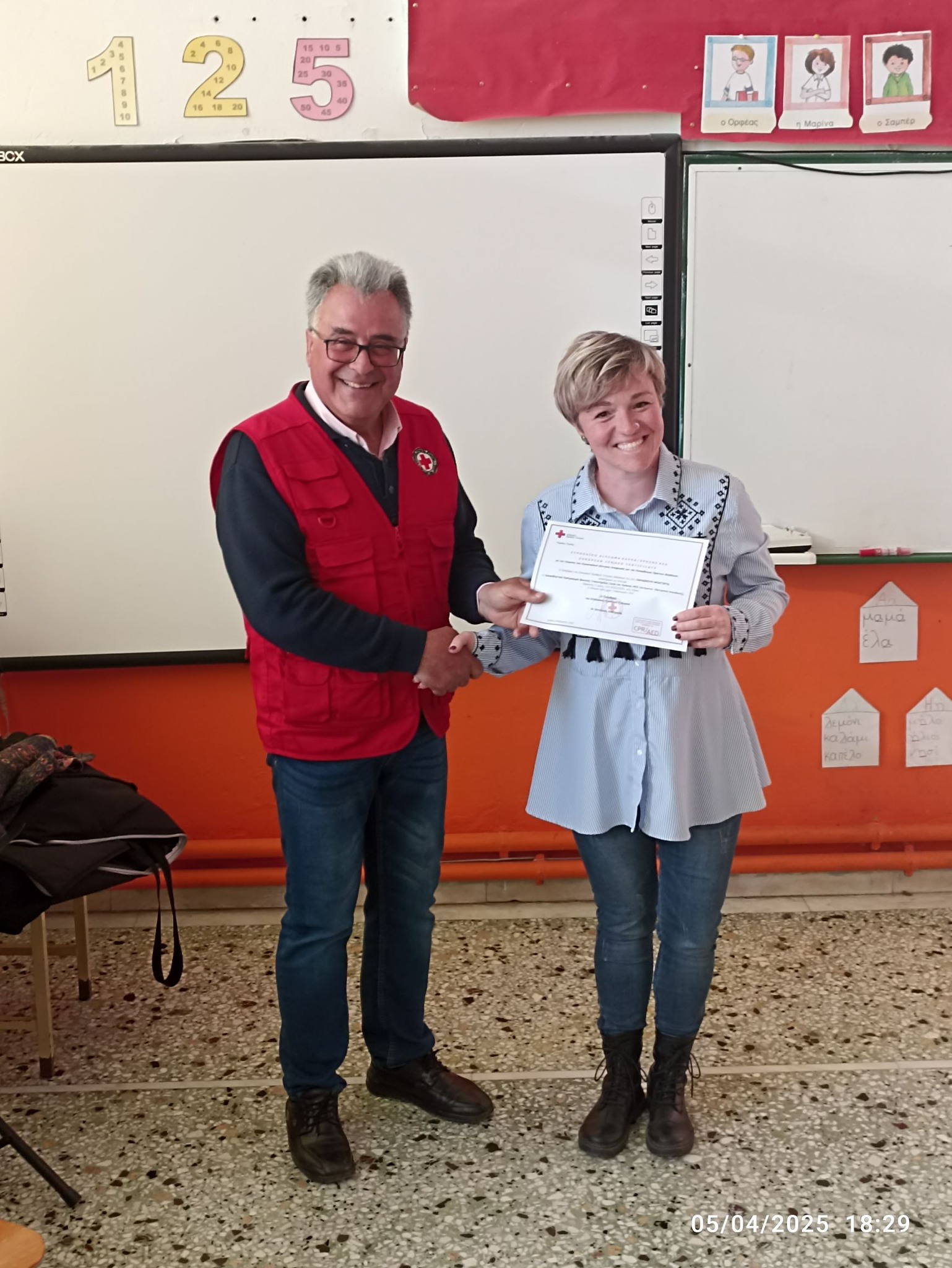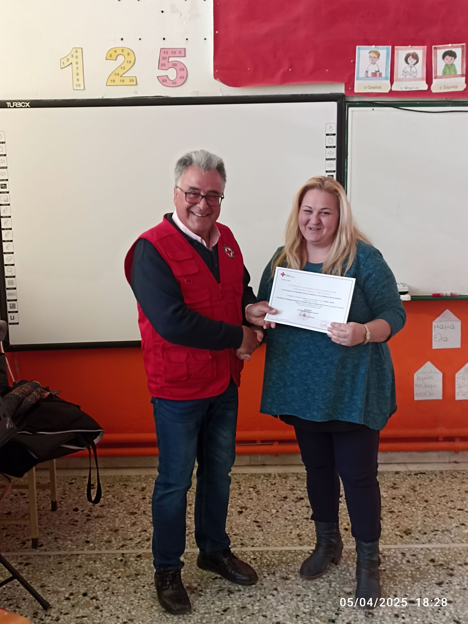 Την απονομή των πιστοποιητικών την έκανε ο Πρόεδρος του Περιφερειακού Τμήματος του Ελληνικού Ερυθρού Σταυρού Λήμνου και Αγίου Ευστρατίου κ. Δημήτριος Αχιλαδέλλης μαζί με την εθελόντρια του τμήματος κ. Αργυρώ Μαχαιρούδη.