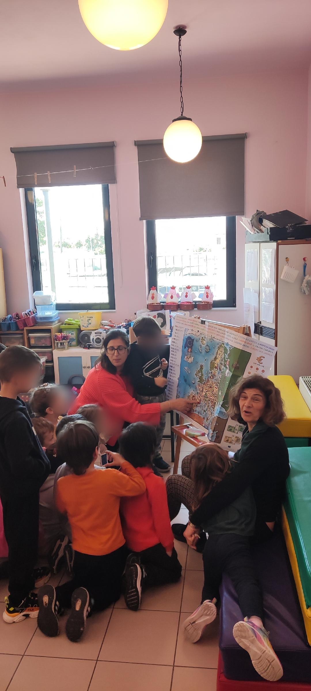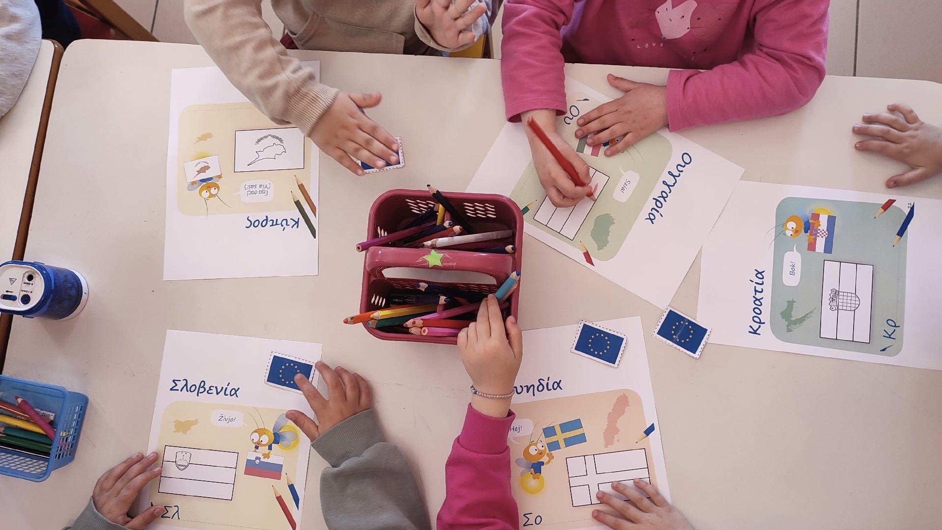 Στη συνέχεια, παρουσιάστηκε αφίσα με τον χάρτη της Ευρώπης, πλούσια σε εθνικά χαρακτηριστικά κάθε χώρας. Τα παιδιά ζωγράφισαν σημαίες των κρατών-μελών, έγραψαν τα ονόματά τους και τις τοποθέτησαν στον χάρτη, ενισχύοντας την αίσθηση του ανήκειν σε μια ευρύτερη ευρωπαϊκή οικογένεια.