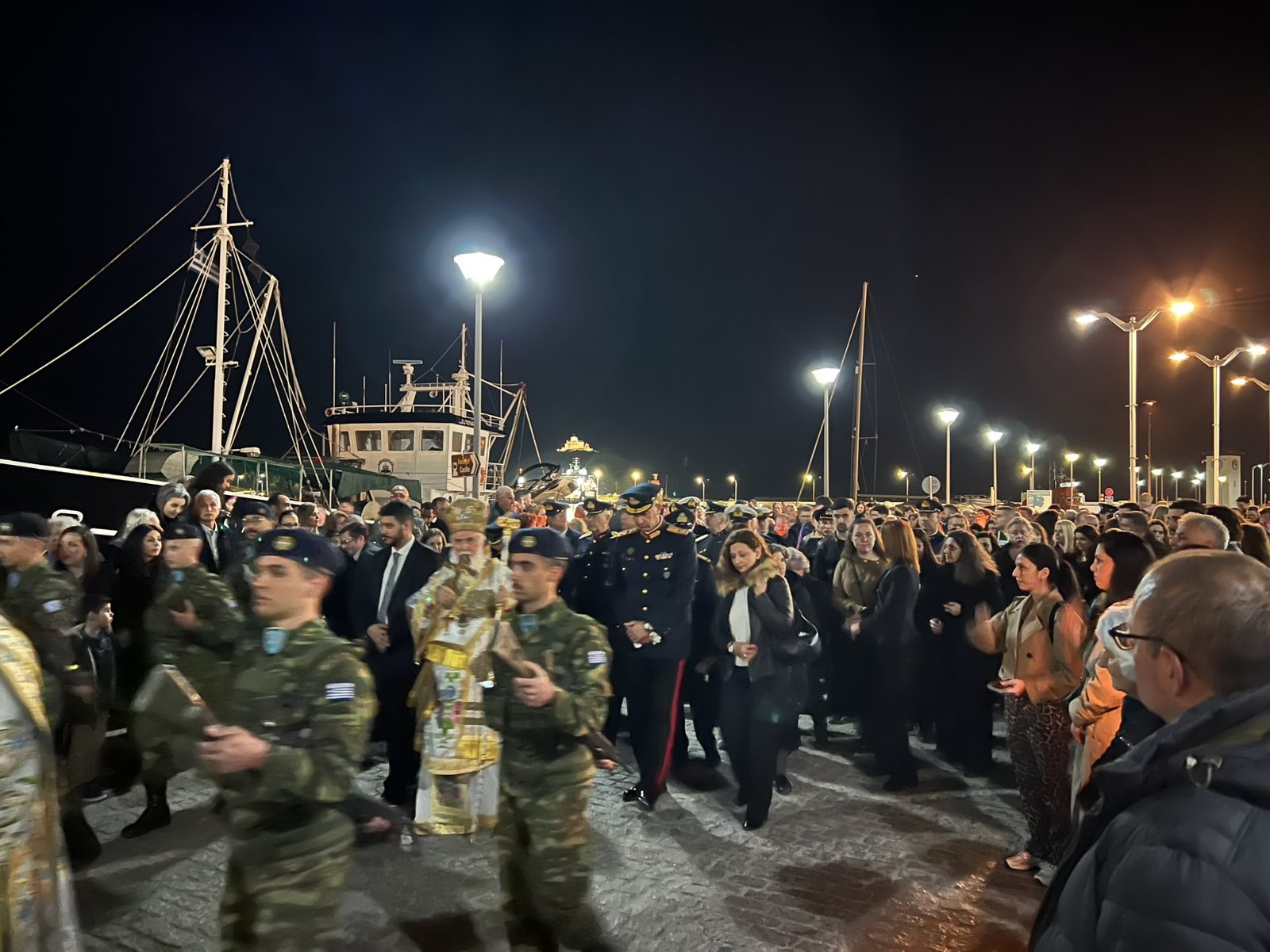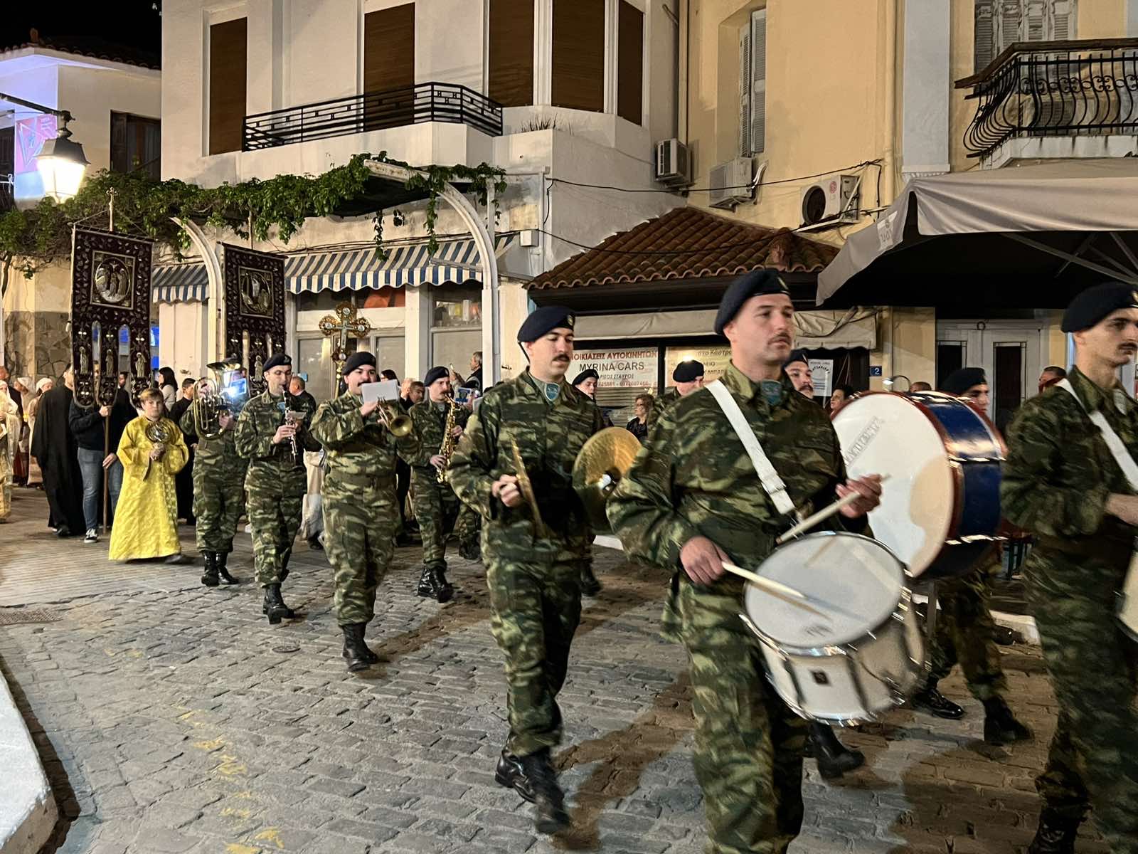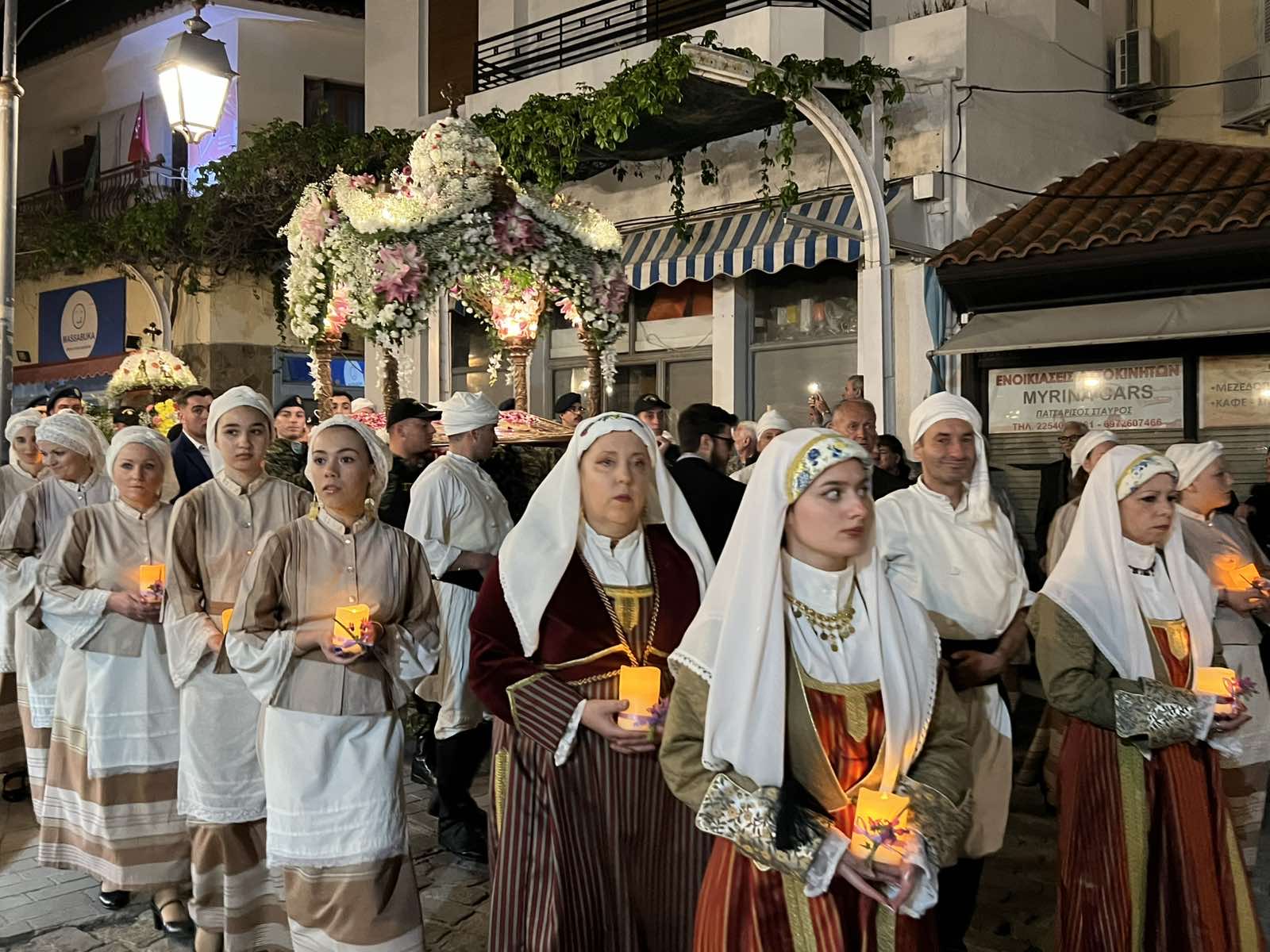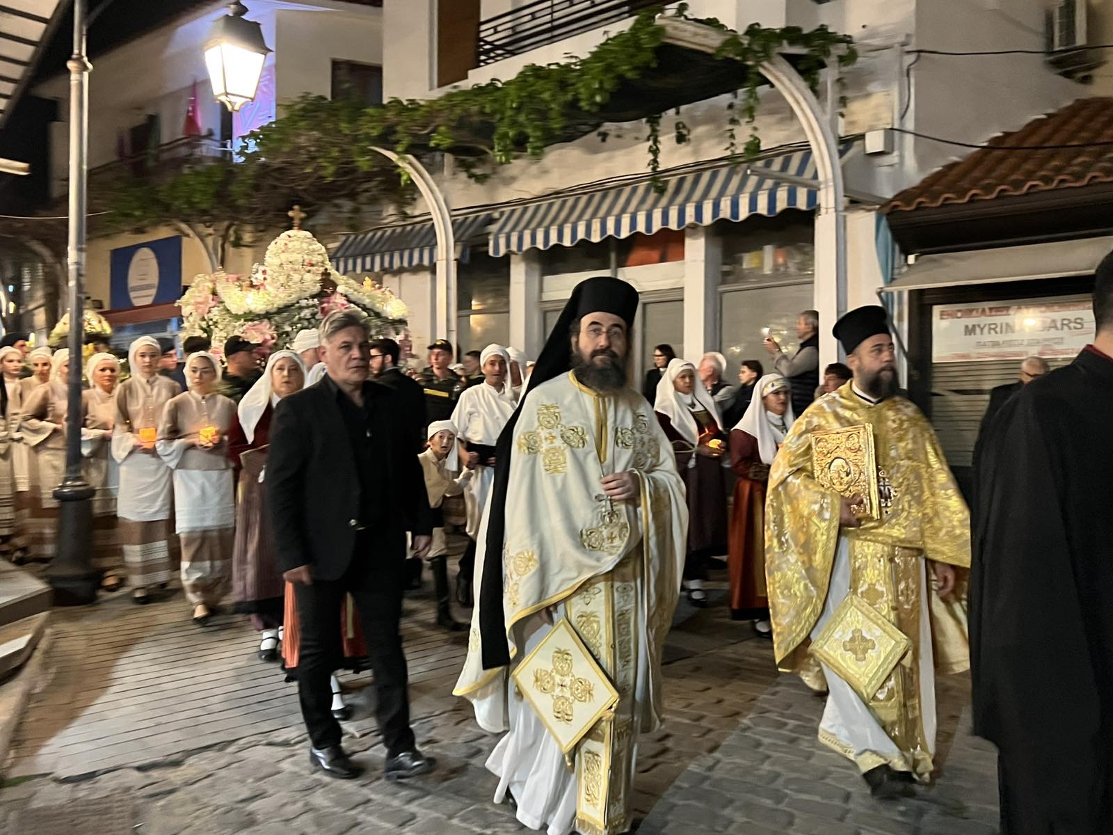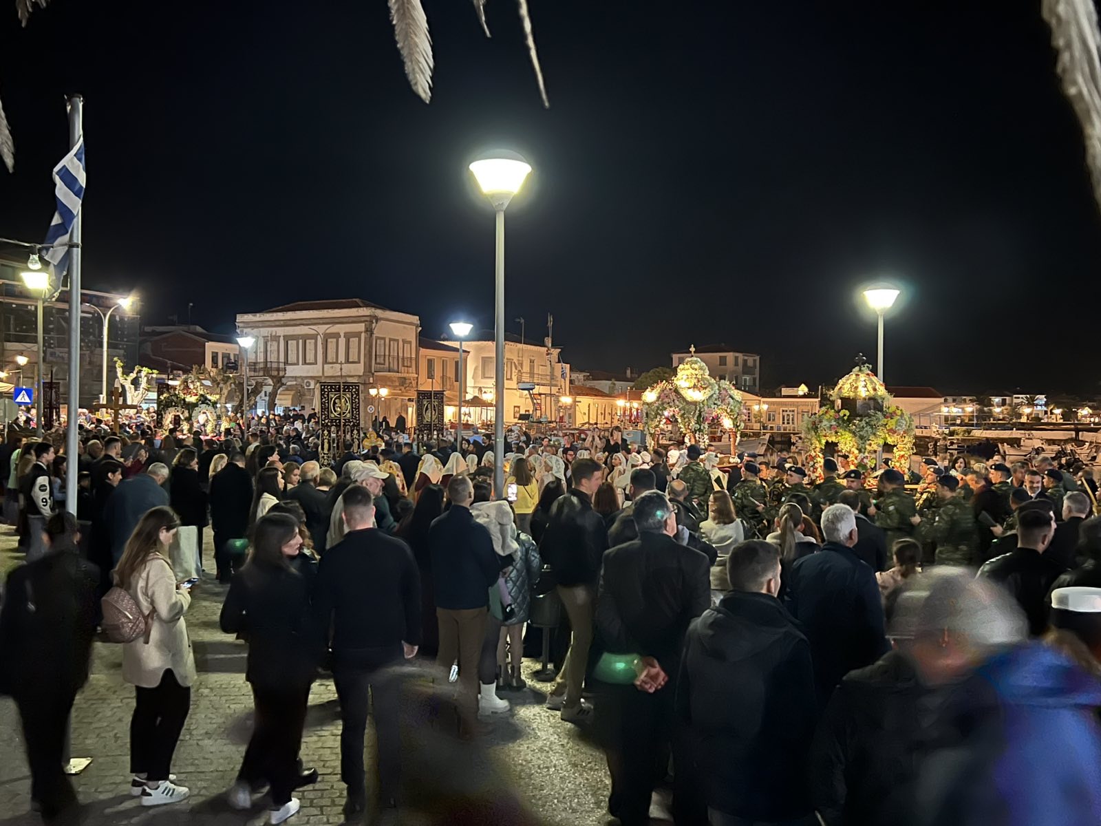 Στο καθιερωμένο σημείο συνάντησης, στο λιμάνι της Μύρινας, οι τρεις Επιτάφιοι ενώθηκαν σε κοινή λιτανεία και πορεύτηκαν μαζί ως το Δημαρχείο της πόλης.