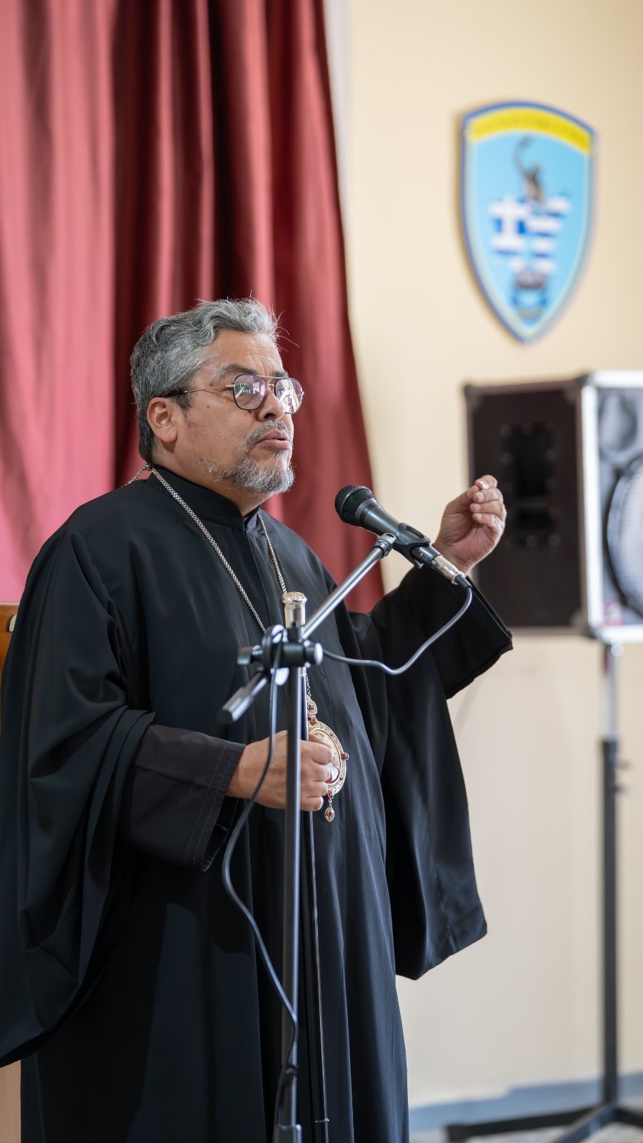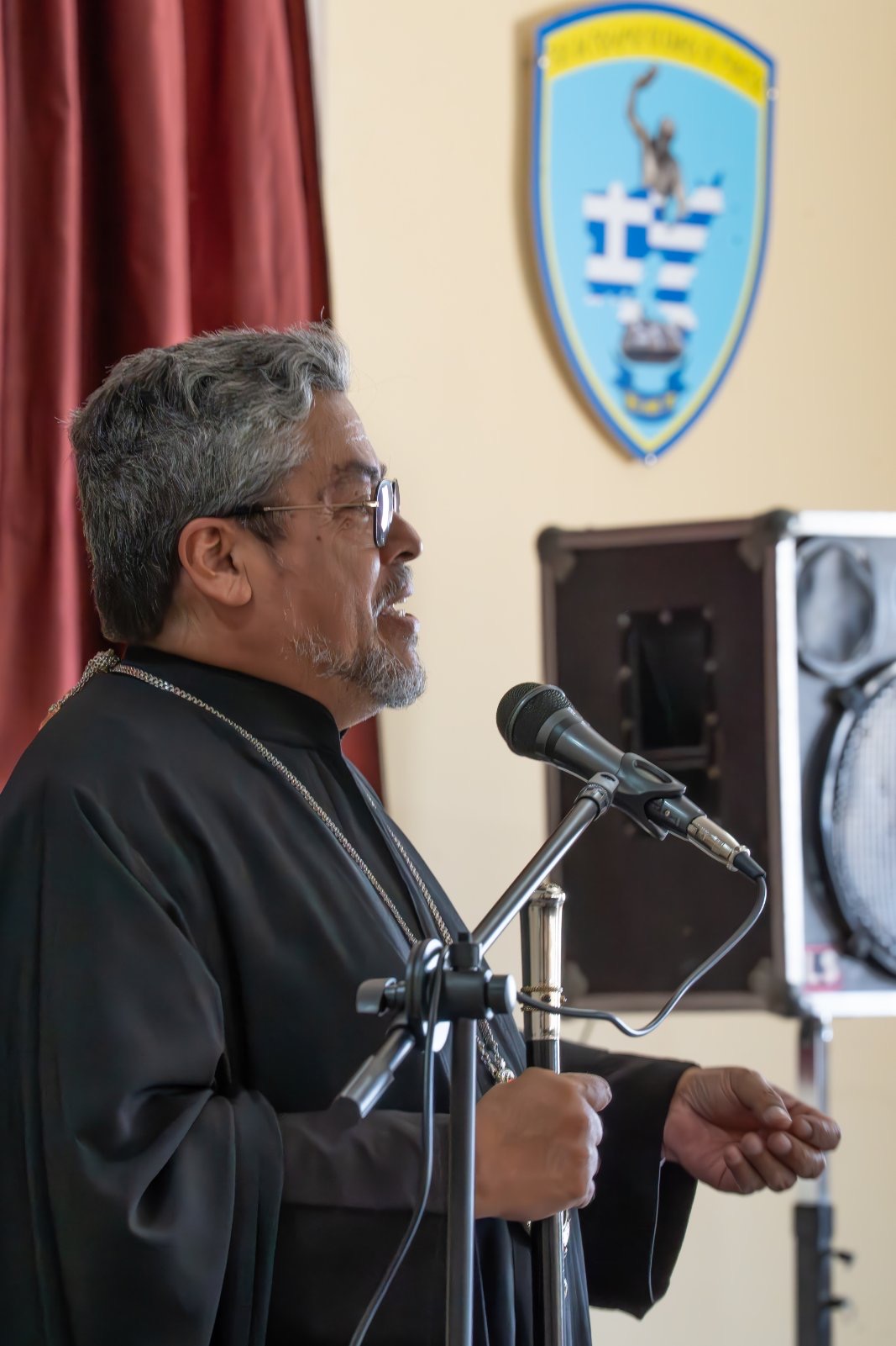 Εκεί ο Ταξίαρχος κ. Πασχάλης Φιλούσης απηύθυνε θερμό καλωσόρισμα και χαιρετισμό στους Αρχιερείς και την συνοδεία τους και κάλεσε τον υψηλό Επισκέπτη να λάβει τον λόγο.