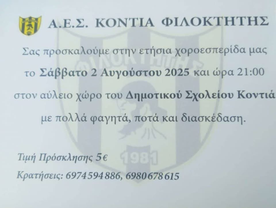 Η ετήσια χοροεσπερίδα του συλλόγου θα πραγματοποιηθεί το Σάββατο 2 Αυγούστου, στις 21:00, στον αύλειο χώρο του Δημοτικού Σχολείου Κοντιά, με εδέσματα, ποτό και μπόλικη, ξαλοξαιρινή διασκέδαση!