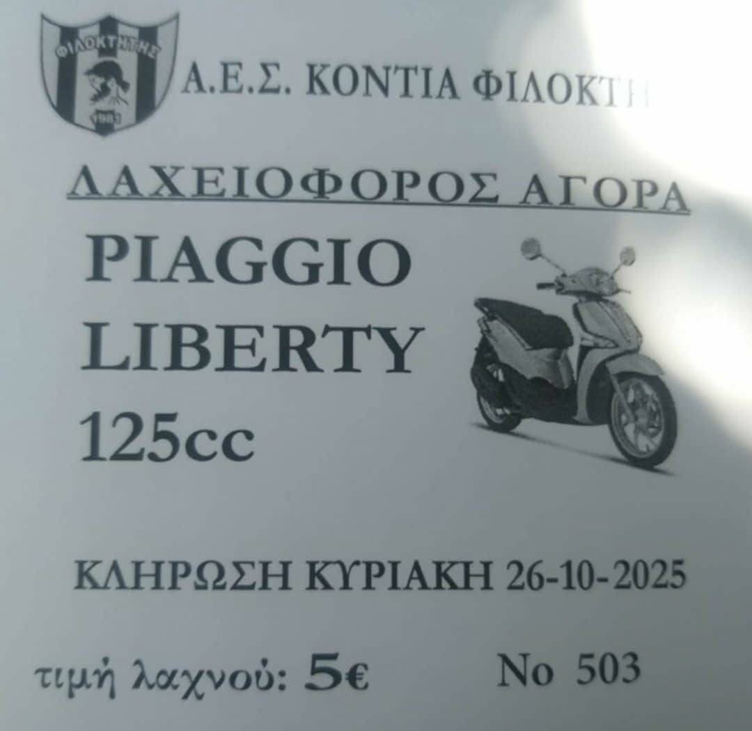Ταυτόχρονα, θα βρίσκεται σε εξέλιξη, η λαχειοφόρος αγορά για την ενίσχυση του συλλόγου, με δώρο ένα ολοκαίνουργιο Piaggio Liberty 125 κυβικών.
