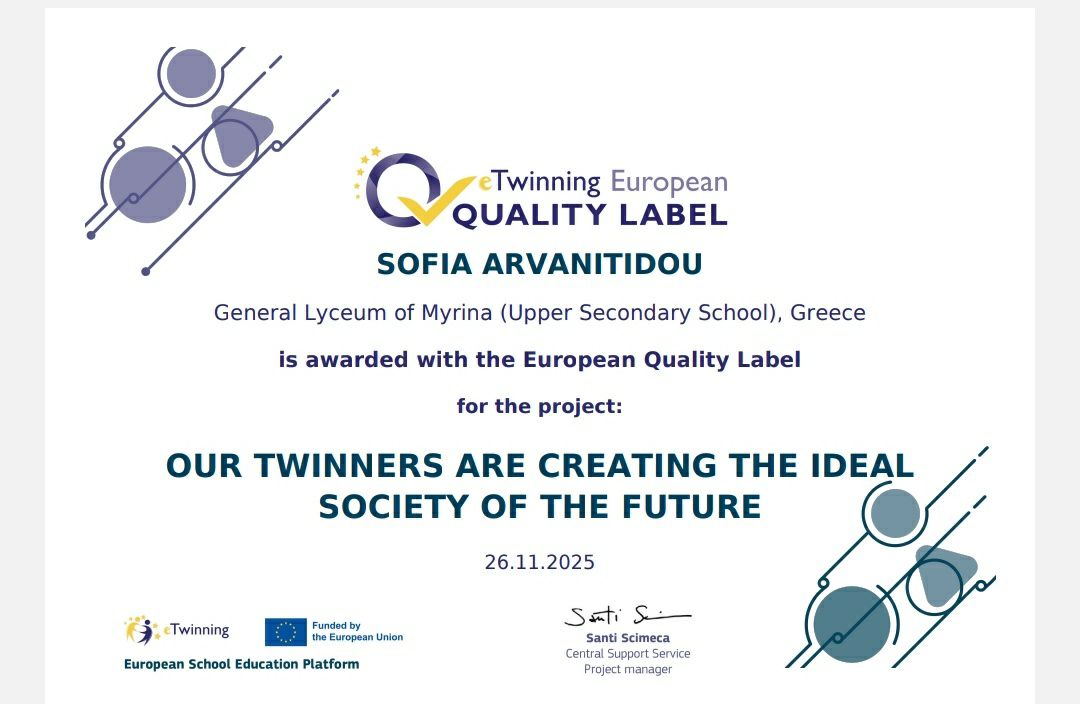 Παράλληλα, το eTwinning έργο «Our Twinners are creating the Ideal Society of the future», που υλοποιήθηκε πέρσι με μαθητές της Α’ Λυκείου υπό τον συντονισμό της εκπαιδευτικού Αγγλικής Φιλολογίας Σοφίας Αρβανιτίδου και πρέσβειρας eTwinningΒορείου Αιγαίου, απέσπασε την Ευρωπαϊκή Ετικέτα Ποιότητας (European Quality Label). Πρόκειται για μια σημαντική διάκριση σε ευρωπαϊκό επίπεδο, με πολύ υψηλή βαθμολογία, που δείχνει τη συνέργεια, τη δημιουργικότητα και την και την άριστη συνεργασία του ΓΕΛ Μύρινας με τα σχολεία των Ευρωπαίων εταίρων. Το έργο δεν ήταν μόνο μια ευκαιρία για μάθηση και χρήση ψηφιακών εργαλείων, αλλά και μια εμπειρία ενεργούς πολιτειότητας (active citizenship). Μέσα από την επικοινωνία με μαθητές άλλων χωρών, καλλιεργήθηκε η αίσθηση της ευρωπαϊκής ταυτότητας και της συλλογικής υπευθυνότητας.