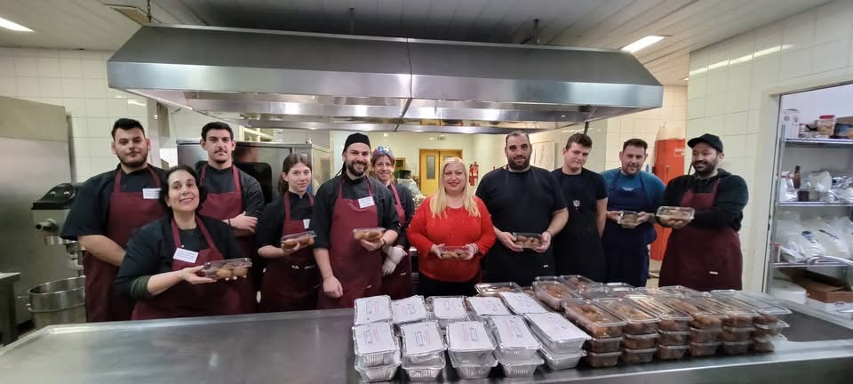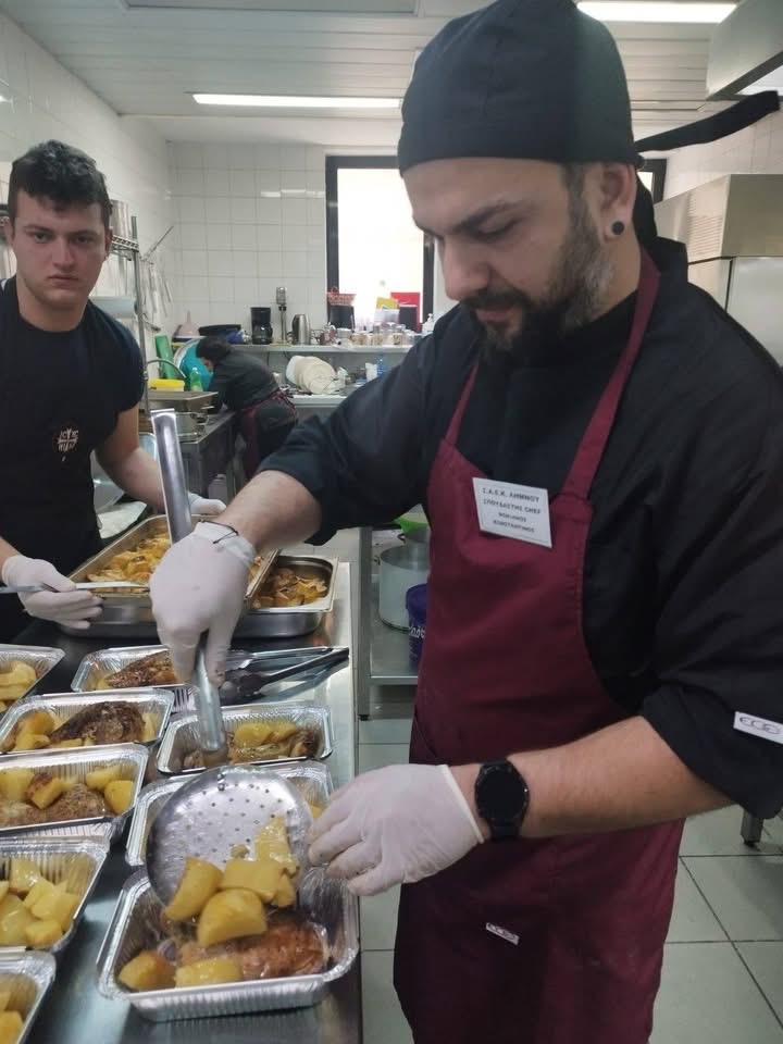 Με τη χορηγία της Ιεράς Μητρόπολης όλων των απαραίτητων υλικών, οι έμπειροι σεφ – εκπαιδευτές της ΣΑΕΚ, κ. Χρήστος Ντίνος και κ. Γιώργος Κιουρανάκης, μαζί με τους σπουδαστές του Τμήματος, μαγείρεψαν 200 γεύματα αγάπης στην επαγγελματική κουζίνα του Νοσοκομείου Λήμνου, η οποία αξιοποιείται για την πραγματοποίηση των εργαστηριακών μαθημάτων Μαγειρικής της Σχολής.