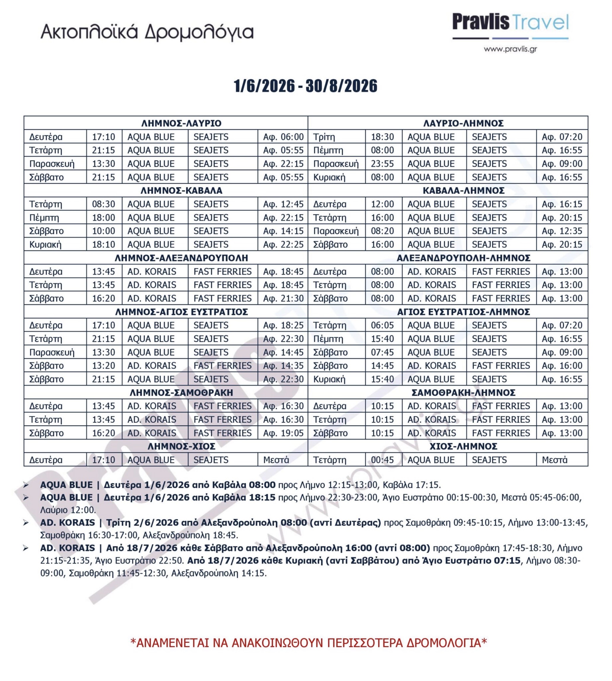 Σημειωτέον, από τα μέσα Μαρτίου, στη γραμμή Λαύριο–Λήμνος επανέρχεται το Aqua Blue της SeaJets, το οποίο αναλαμβάνει τα καλοκαιρινά δρομολόγια!