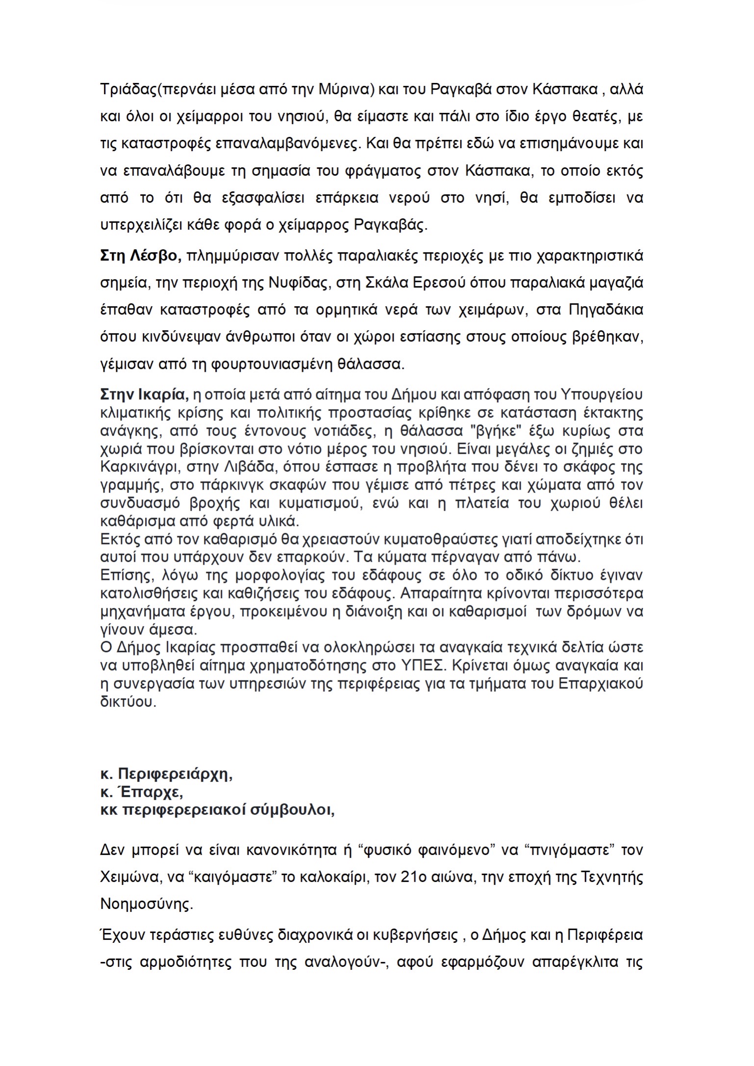 Στην παρέμβασή της επισημαίνει την ανάγκη ουσιαστικών αντιπλημμυρικών έργων, καταγραφής των ζημιών και εκπόνησης ολοκληρωμένου σχεδιασμού για τα «ανoχύρωτα» σημεία των νησιών, με ιδιαίτερη αναφορά στα προβλήματα που καταγράφηκαν σε Λήμνο, Χίο, Λέσβο και Ικαρία.