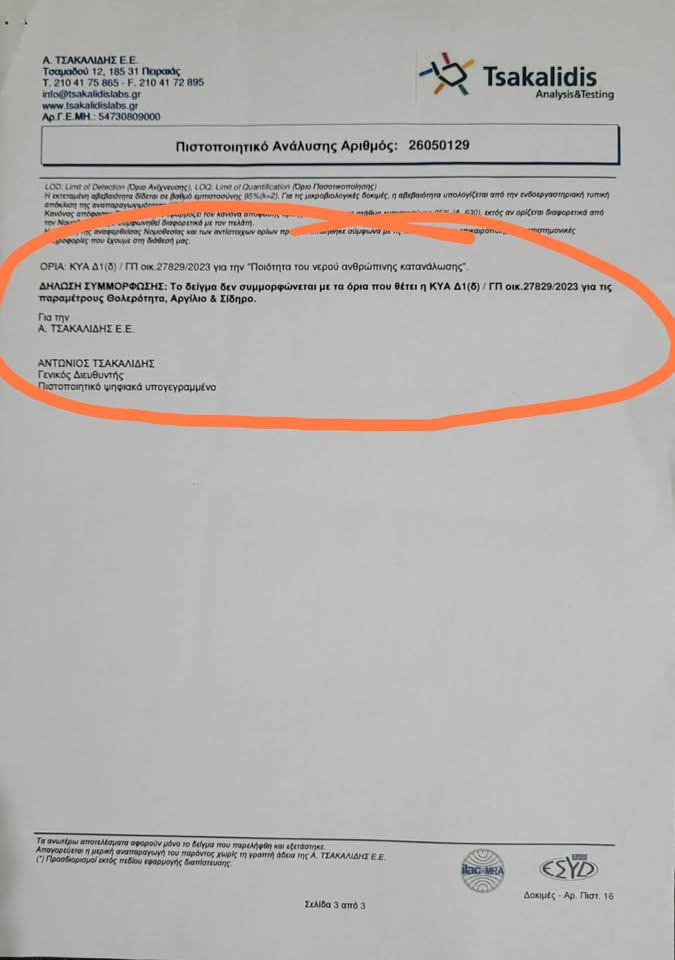 Σαν τελικό συμπέρασμα της ανάλυσης αναφέρεται, μάλιστα, ότι «ΔΗΛΩΣΗ ΣΥΜΜΟΡΦΩΣΗΣ: Το δείγμα δεν συμμορφώνεται με τα όρια που θέτει η ΚΥΑ Δ1(δ) / ΓΠ οικ.27829/2023 για τις παραμέτρους Θολότητα, Αργίλιο & Σίδηρο».