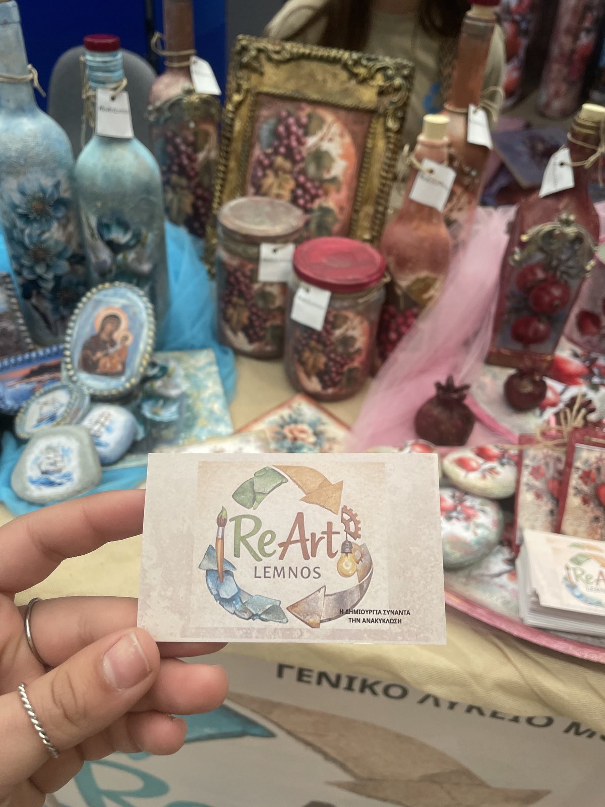 Η ομάδα ReArt Lemnos παρουσίασε στο κοινό και στην κριτική επιτροπή το εγχείρημά της, το οποίο βασίζεται στις αρχές της κυκλικής οικονομίας και της δημιουργικής επαναχρησιμοποίησης υλικών. Μέσα από τη μετατροπή γυάλινων αντικειμένων σε καλαίσθητα διακοσμητικά προϊόντα, οι μαθητές και οι μαθήτριες ανέδειξαν στην πράξη τη σημασία της βιώσιμης ανάπτυξης, της υπεύθυνης κατανάλωσης και της προστασίας του περιβάλλοντος.