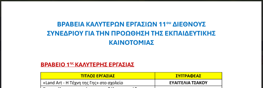 Με ιδιαίτερη τιμή και χαρά σας ανακοινώνουμε πως το έργο που υλοποιήθηκε από την εκπαιδευτικό Γαλλικής γλώσσας, κ. Ευαγγελία Τσάκου, κατά το σχολικό έτος 2024-2025 στο Γυμνάσιο Μούδρου «Αργύριος Μοσχίδης», με τίτλο «Land Art-Η Τέχνη της Γης στο σχολείο», βραβεύτηκε σήμερα με το 1ο βραβείο ως η καλύτερη εργασία που παρουσιάστηκε στο 11ο Διεθνές Συνέδριο για την Προώθηση της Εκπαιδευτικής Καινοτομίας στη Λάρισα τον Οκτώβριο 2025.