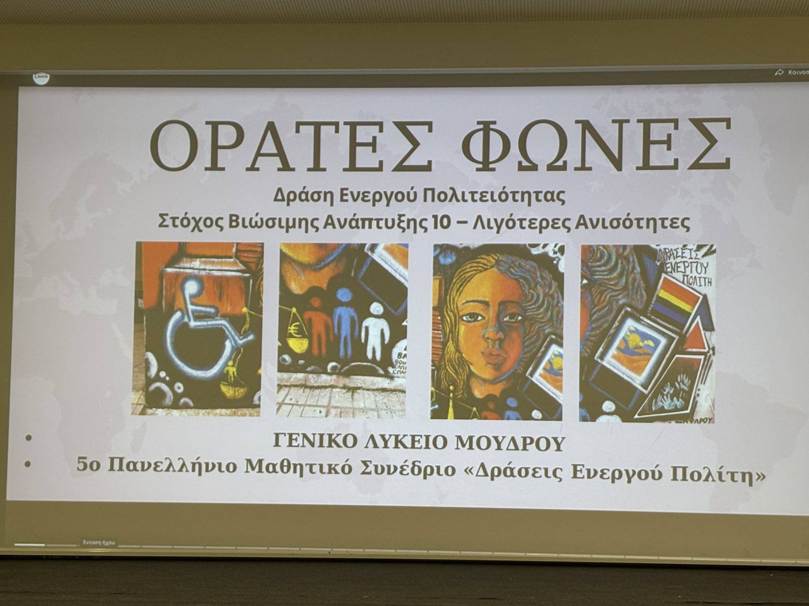 Με ιδιαίτερη επιτυχία ολοκληρώθηκε η συμμετοχή του Γενικού Λυκείου Μούδρου στο 5ο Πανελλήνιο Μαθητικό Συνέδριο «Δράσεις Ενεργού Πολίτη», που συνδιοργάνωσε το Ινστιτούτο Εκπαιδευτικής Πολιτικής και το 1ο Πρότυπο ΓΕΛ Αθηνών – Γεννάδειο με την υποστήριξη του Εργαστηρίου Παιδαγωγικής Έρευνας και Εφαρμογών, Εκπαιδευτικής Τεχνολογίας και Παραγωγής Εκπαιδευτικού Υλικού του Τμήματος Κοινωνικής Θεολογίας και Θρησκειολογίας, ΕΚΠΑ και το οποίο πραγματοποιήθηκε στο Υπουργείο Παιδείας, Θρησκευμάτων και Αθλητισμού. Την Παρασκευή 24 Απριλίου 2026, στην αίθουσα «Jacqueline de Romilly», οι μαθητές και οι μαθήτριες του σχολείου παρουσίασαν τη δράση με τίτλο «Ορατές Φωνές – Δημιουργώντας χώρο για λιγότερες ανισότητες», στο πλαίσιο της θεματικής ενότητας «Λιγότερες Ανισότητες».