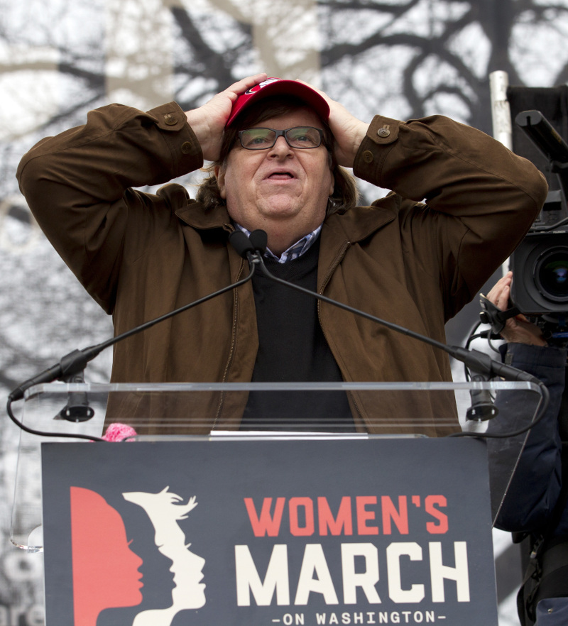 «Είμαστε στη δεύτερη ημέρα της τραγωδίας Τραμπ. Είμαστε εδώ για να ορκιστούμε να βάλουμε ένα τέλος στο μακελειό του», τους είπε ο Μάικλ Μουρ με τον σκηνοθέτη να καλεί σε αλλαγή στο κόμμα των Δημοκρατικών
