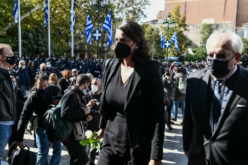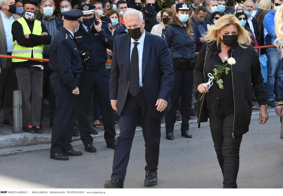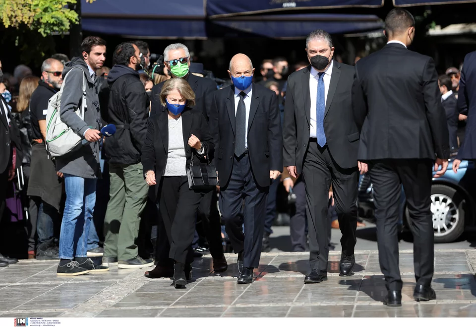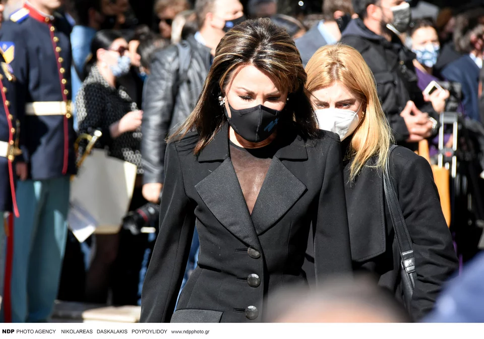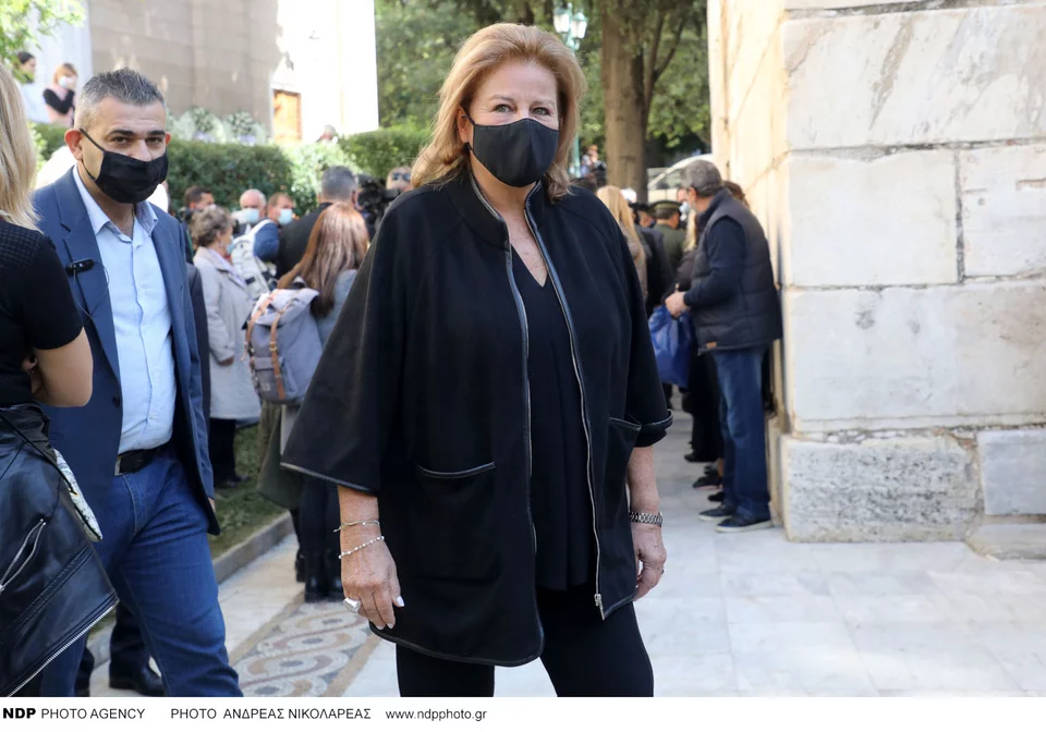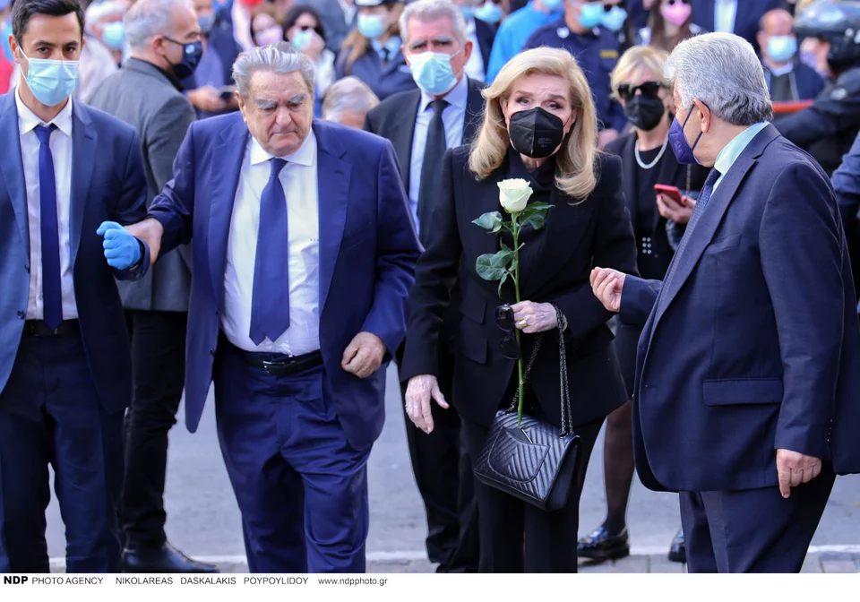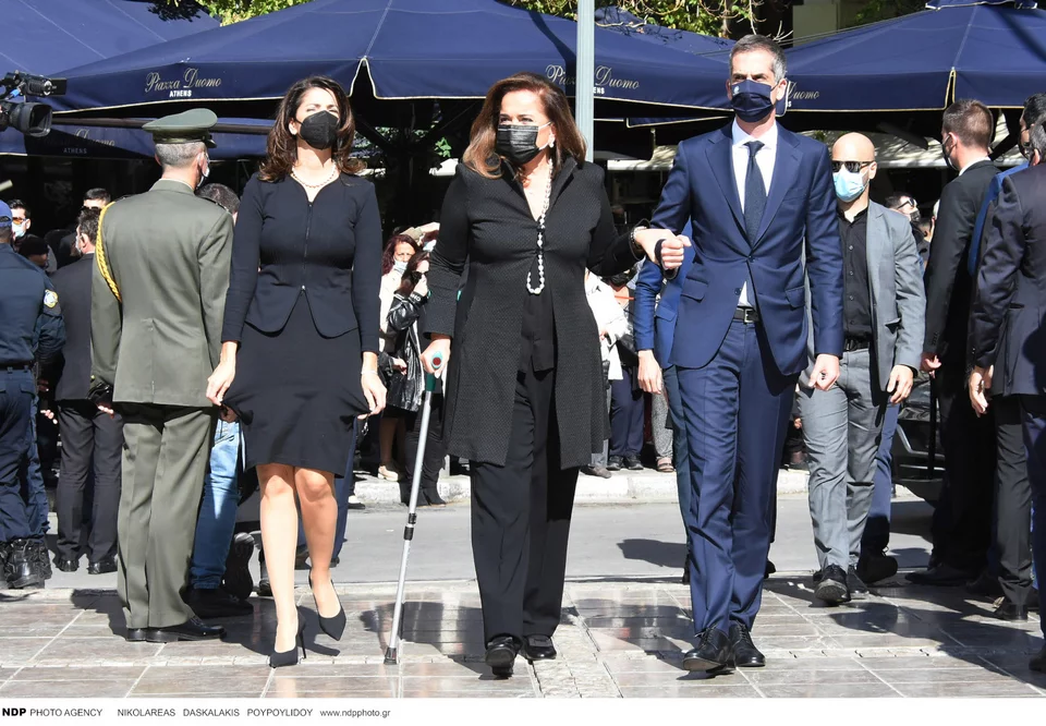 Τα βλέμματα όλων τράβηξε η παρουσία της Ντόρας Μπακογιάννη, η οποία εισήλθε στη Μητρόπολη κρατώντας με το δεξί της χέρι τον γιο της, Κώστα, και στηριζόμενη σε μπαστούνι, καθώς δεν έχει ξεπεράσει το πρόβλημα στο γόνατο.