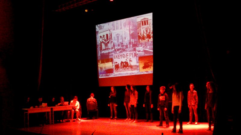 Οι μαθητές του Γυμνασίου της Μύρινας τίμησαν τη μνήμη των πεσόντων του Πολυτεχνείου με μια εκδήλωση που περιελάμβανε θεατρικό δρώμενο από το βιβλίο της Κωστούλας Μητροπούλου "Το χρονικό των τριών ημερών".