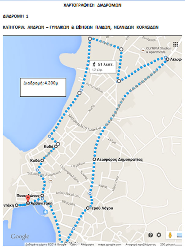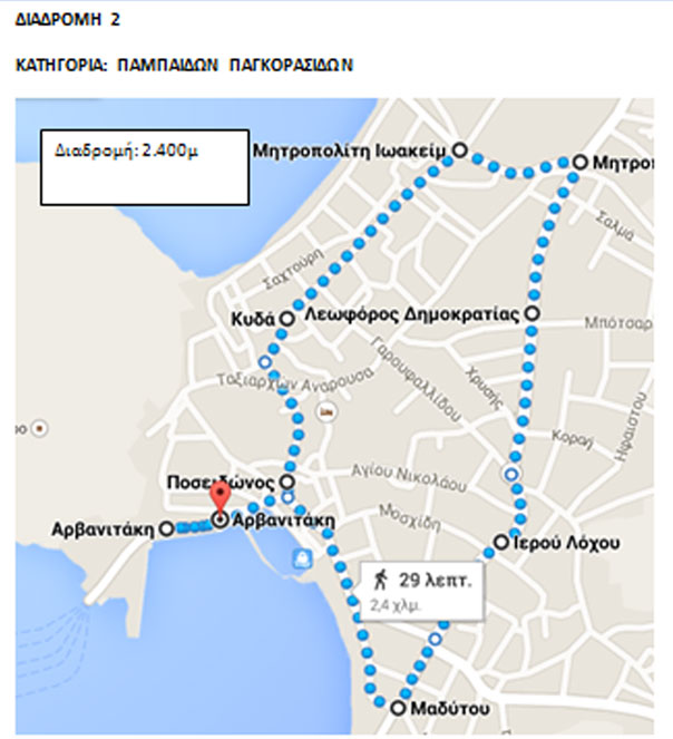 1) Εκκίνηση στο Ρολόι (παλιό λιμάνι), 2) κατεύθυνση προς κτηνιατρείο, 2) στροφή αριστερά προς πλατεία «Τρίφωτο» 3) στροφή αριστερά με κατεύθυνση προς Δημαρχείο 4) τερματισμός μπροστά στο Δημαρχείο. (ΛΟΓΩ ΕΡΓΩΝ ΣΤΗΝ ΥΨΗΛΑΝΤΟΥ ΕΝΔΕΧΕΤΑΙ ΜΙΚΡΗ ΤΡΟΠΟΠΟΙΗΣΗ ΤΗΣ ΔΙΑΔΡΟΜΗΣ, Η ΟΠΟΙΑ ΘΑ ΑΝΑΚΟΙΝΩΘΕΙ ΑΝ ΧΡΕΙΑΣΤΕΙ ΠΡΙΝ ΤΗΝ ΕΝΑΡΞΗ ΤΟΥ ΑΓΩΝΑ)