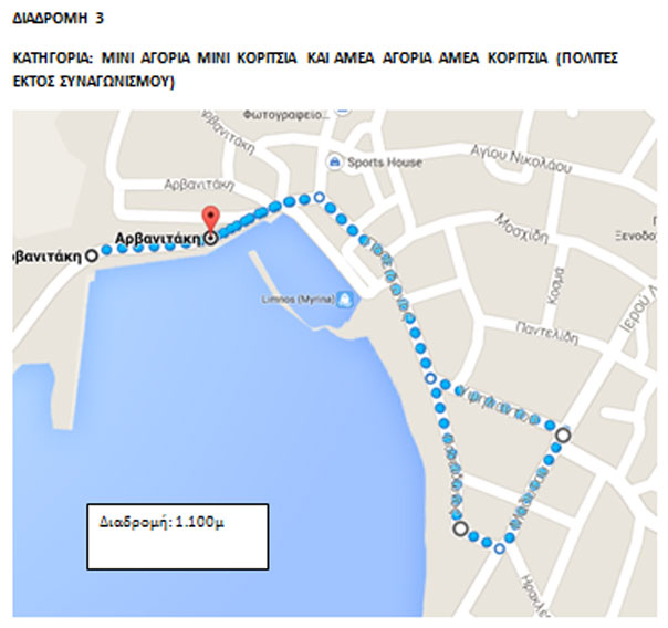 Η εκκίνηση του αγώνα θα δοθεί στις 19:00 μ.μ. για όλες τις κατηγορίες στο Ρολόι στο παλιό λιμάνι και ο τερματισμός θα γίνει στο Δημαρχείο Λήμνου.