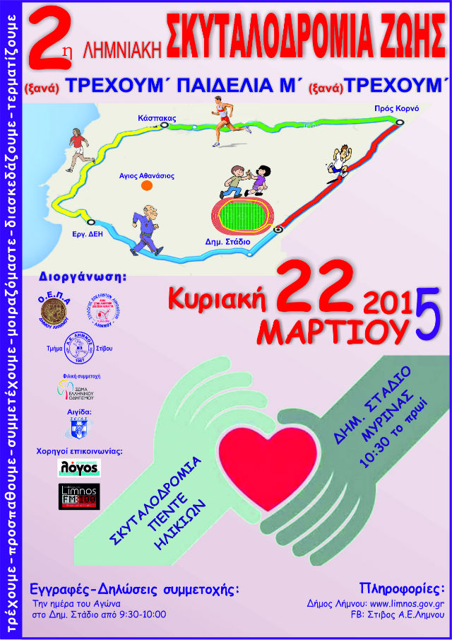 Ο Οργανισμός Πολιτισμού, Εκπαίδευσης, Δια βίου Μάθησης και Αθλητισμού» του Δήμου Λήμνου, σε συνεργασία με το τμήμα Στίβου της Αθλητικής Ένωσης Λήμνου, τον Σύλλογο Αιμοδοτών Λήμνου, την φιλική συμμετοχή του Σώματος Ελληνικού Οδηγισμού, υπό την αιγίδα της Ε.Α.Σ. Σ.Ε.Γ.Α.Σ Λέσβου, προκηρύσσουν Αγώνα σκυταλοδρομίας πέντε ηλικιών με την ονομασία «2η ΛΗΜΝΙΑΚΗ ΣΚΥΤΑΛΟΔΡΟΜΙΑ ΖΩΗΣ» και χαρακτηριστικό τίτλο «ΤΡΕΧΟΥΜ' ΠΑΙΔΕΛΙΑΜ' ΤΡΕΧΟΥΜ'» με τους παρακάτω όρους:
