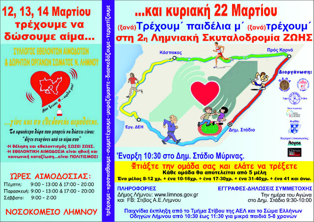 Ο Οργανισμός Πολιτισμού, Εκπαίδευσης, Δια βίου Μάθησης και Αθλητισμού του Δήμου Λήμνου, σε συνεργασία με το τμήμα Στίβου της Αθλητικής Ένωσης Λήμνου, τον Σύλλογο Αιμοδοτών Λήμνου, με τη φιλική συμμετοχή του Σώματος Ελληνικού Οδηγισμού και υπό την αιγίδα της Ε.Α.Σ. Σ.Ε.Γ.Α.Σ Λέσβου, πραγματοποιούν την Κυριακή 22 Μαρτίου και ώρα 10:30 π.μ. στο Δημοτικό Στάδιο Μυρίνας, αγώνα σκυταλοδρομίας πέντε ηλικιών, με την ονομασία «2η ΛΗΜΝΙΑΚΗ ΣΚΥΤΑΛΟΔΡΟΜΙΑ ΖΩΗΣ» καιχαρακτηριστικό τίτλο «ξαναΤΡΕΧΟΥΜ’ ΠΑΙΔΕΛΙΑ Μ’ ξαναΤΡΕΧΟΥΜ’».