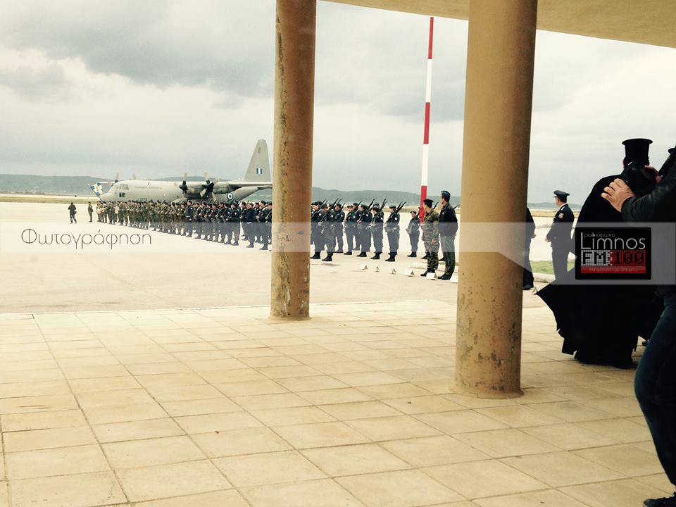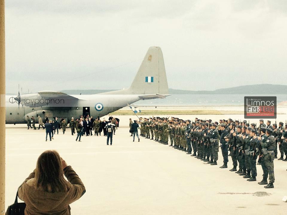 Τους επισήμους υποδέχθηκε Άγημα του Στρατού και της Πολεμικής Αεροπορίας, ενώ παρόντες στην υποδοχή ήταν η Περιφερειάρχης Βορείου Αιγαίου κα Χριστιάνα Καλογήρου, ο Γενικός Γραμματέας Αιγαίου και Νησιωτικής Πολιτικής κ. Γιάννης Γιαννέλης, ο Δήμαρχος Λήμνου, κ. Δημήτρης Μαρινάκης, ο Αντιδήμαρχος, κ. Σαράντης Πανταζής, ο Έπαρχος, κ. Βαγγέλης Γιαρμαδούρος και ο Μητροπολίτης Λήμνου και Αγίου Ευστρατίου, κ.κ. Ιερόθεος.