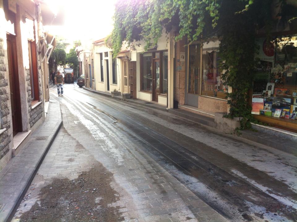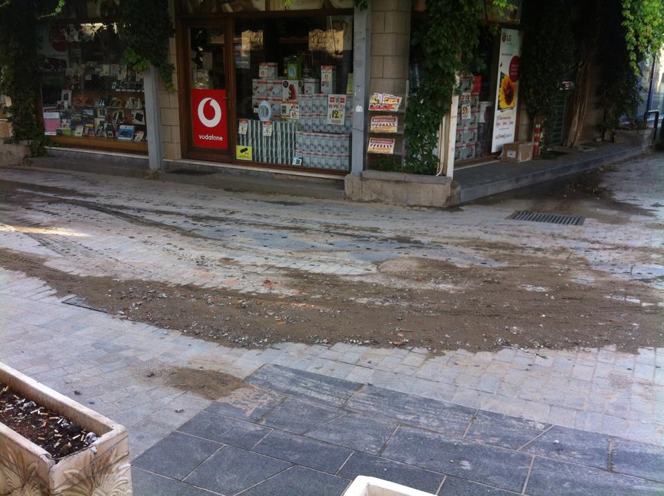 Οι εργασίες που εκτελούνται για το αποχετευτικό δίκτυο, σε παρακείμενο δρόμο της αγοράς που οδηγεί στο Κάστρο ήταν η αιτία του κακού, καθώς η ορμή του νερού κατά τη διάρκεια της βροχόπτωσης παρέσυρε τα χώματα, μεταφέροντας τα στο δρόμο της κεντρικής αγοράς και δημιουργώντας ένα χείμαρρο λάσπης.