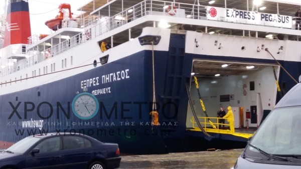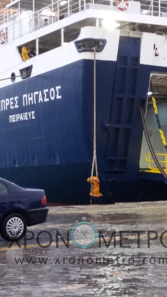 Όπως αναφέρει το xronometro.com, ο σφοδρός άνεμος που συνοδεύονταν και από ισχυρή βροχή, ανάγκασε το πλοίο Εξπρές Πήγασος να μεταβάλλει τη θέση ελλιμενισμού του.