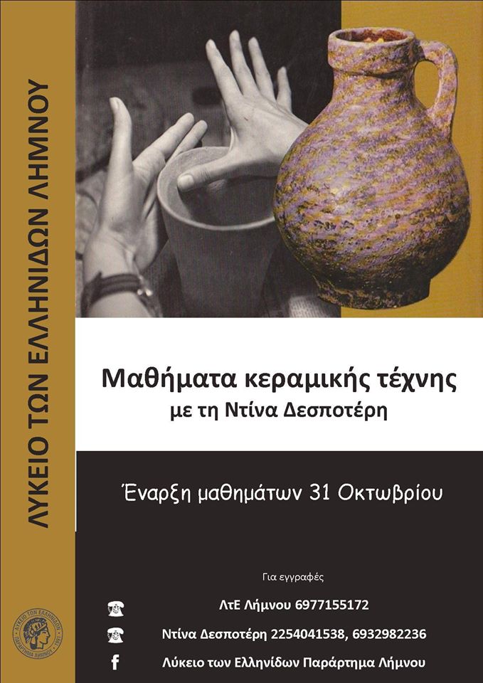 Η κεραμική θα πραγματοποιείται κάθε Σάββατο 4-7μ.μ. Η Ντίνα Δεσποτέρη θα μυήσει τους συμμετέχοντες στις βασικές αρχές της αγγειοπλαστικής και θα παράγει μαζί τους αντικείμενα εμπνευσμένα από παραδοσιακά στοιχεία του λαογραφικού αρχείου του Λυκείου των Ελληνίδων Λήμνου. Θα δουλευτεί ο πηλός, και μετά την παραγωγή του αντικειμένου, θα ακολουθήσει το ψήσιμο στο καμίνι και η διακόσμηση. Ο κύκλος του σεμιναρίου διαρκεί 2 μήνες.
