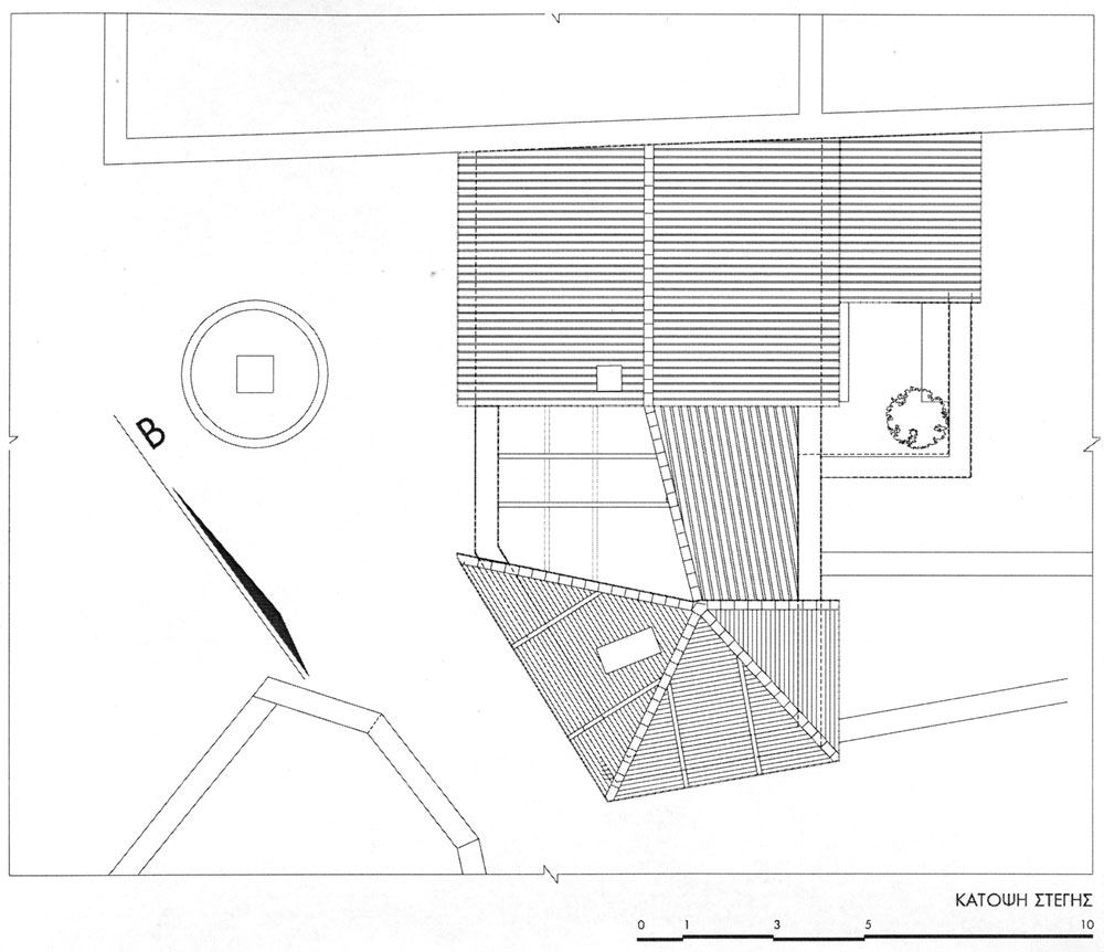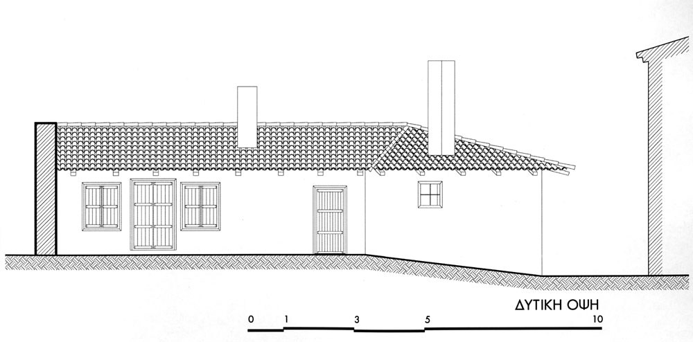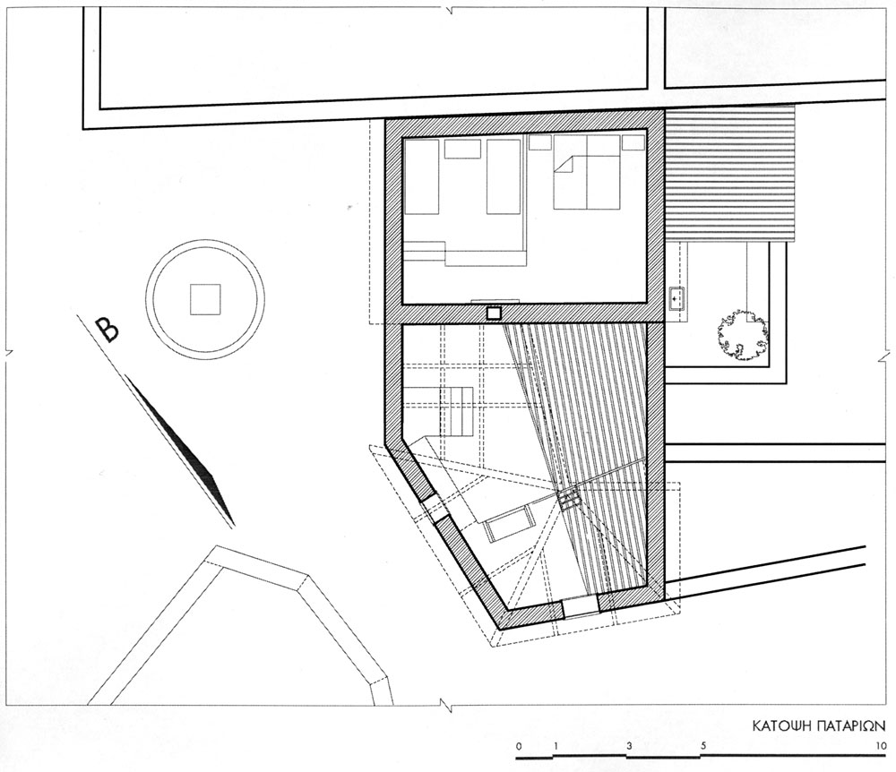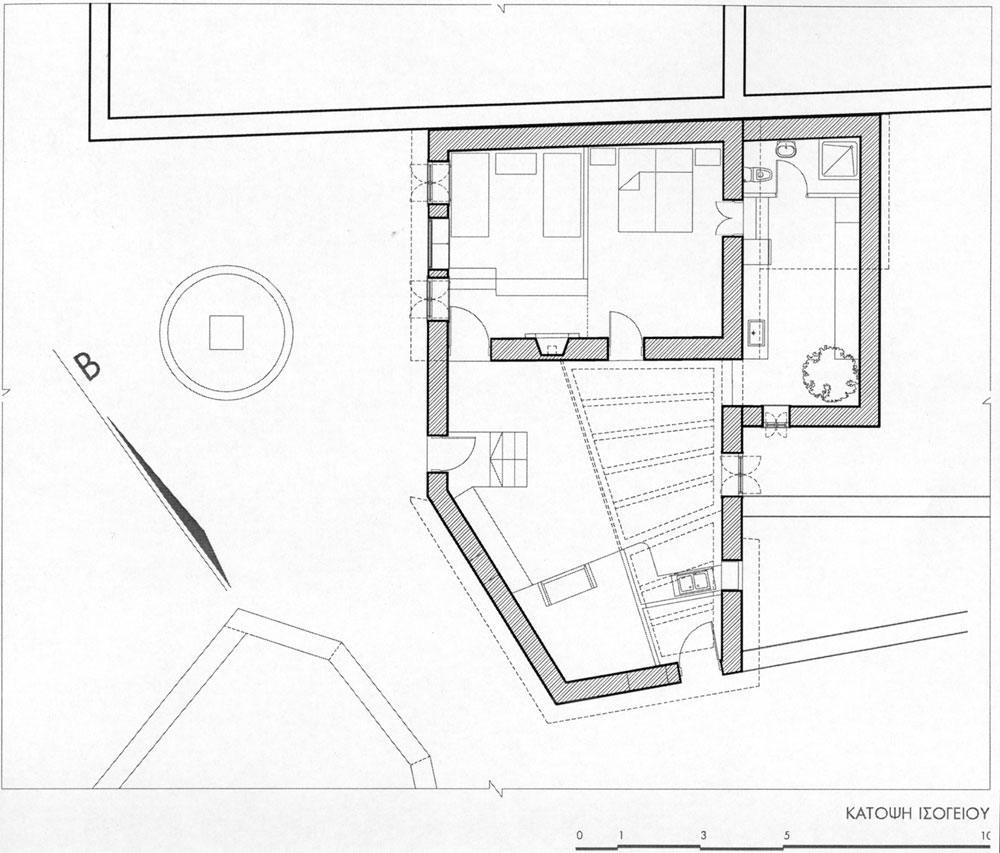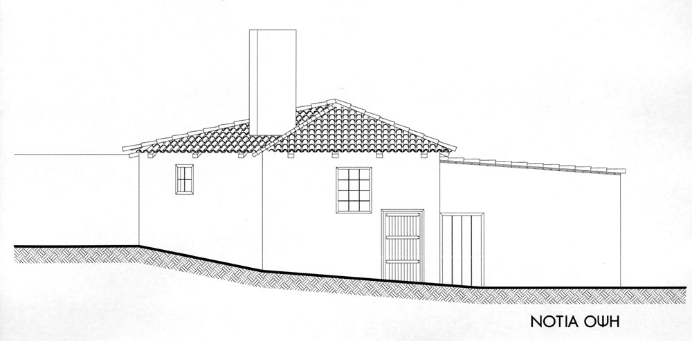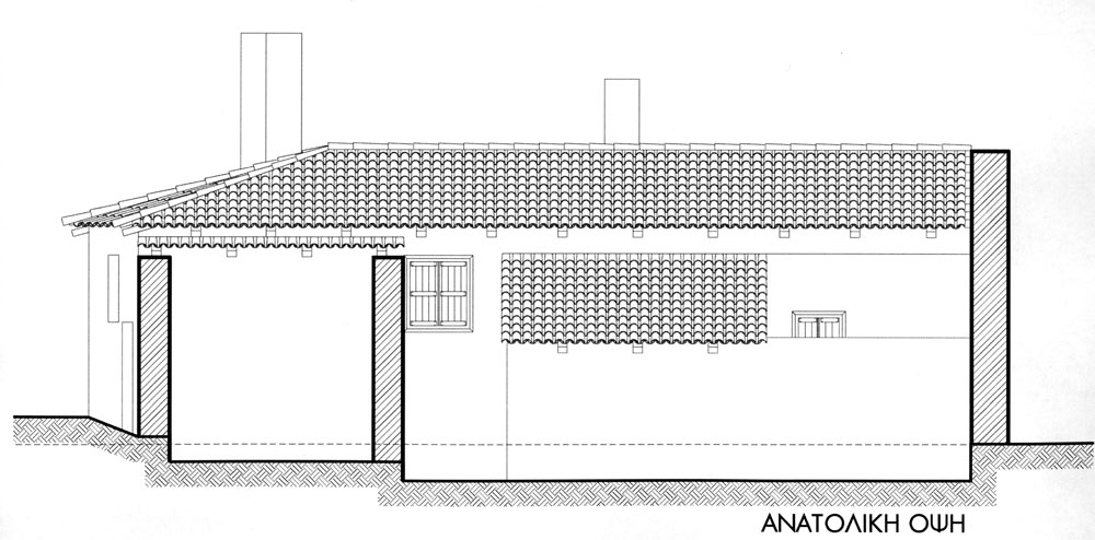 Για να επιτευχθούν όσα προαναφέρθηκαν η στέγη αποκαταστάθηκε πλήρως μόνο στον έναν ορθογωνικό χώρο. Έγινε έτσι ιδανικός χώρος υπνοδωματίου για τους καλοκαιρινούς μήνες, δροσερός και ανήλιος. Για να μην αλλοιωθεί η παλιά όψη του κτίσματος, διατηρήθηκαν τα ανοίγματα, τα δύο παράθυρα και η παλιά πόρτα, χωρίς όμως αυτή να χρησιμοποιείται για πρόσβαση στην κατοικία. Για την ανάγκη φιλοξενίας μιας οικογένειας ή μια παρέας, το μονόχωρο διαμορφώθηκε σε δύο επίπεδα. Ο χώρος των παιδιών, ένα καθαρό τετράγωνο σε κάτοψη, υψώθηκε δύο σκαλοπάτια πάνω από τον υπόλοιπο χώρο, και ξεχώρισε. Δίπλα στο υπνοδωμάτιο, στη παλιά αυλή, τοποθετήθηκε το λουτρό που στεγάστηκε και αυτό κανονικά. Η κουζίνα που βρίσκεται απέναντι του έχει την ίδια στέγαση παραμένει όμως ανοιχτή από την μία πλευρά και συνδέεται με τον χώρο του φαγητού.