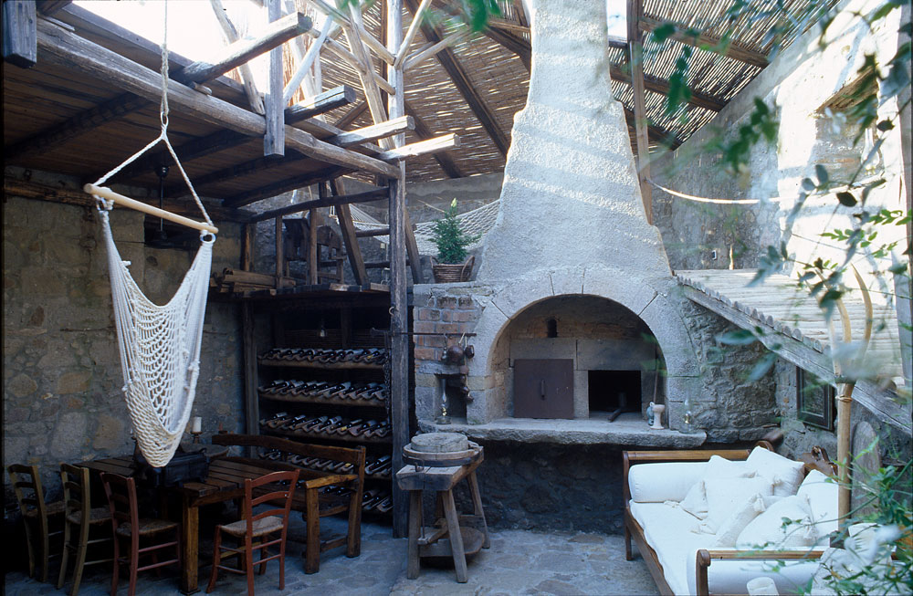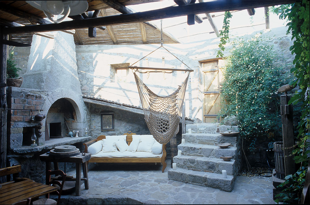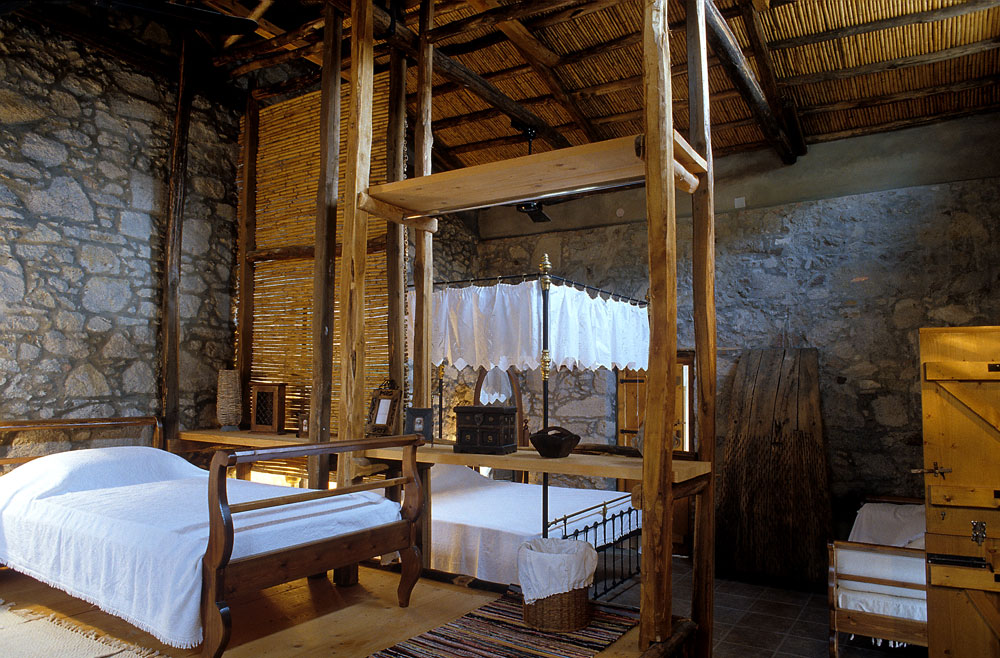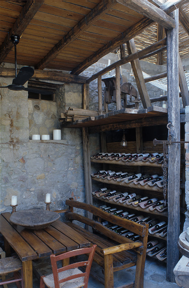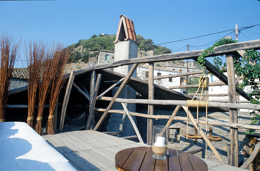 Για να επιτευχθούν όσα προαναφέρθηκαν η στέγη αποκαταστάθηκε πλήρως μόνο στον έναν ορθογωνικό χώρο. Έγινε έτσι ιδανικός χώρος υπνοδωματίου για τους καλοκαιρινούς μήνες, δροσερός και ανήλιος. Για να μην αλλοιωθεί η παλιά όψη του κτίσματος, διατηρήθηκαν τα ανοίγματα, τα δύο παράθυρα και η παλιά πόρτα, χωρίς όμως αυτή να χρησιμοποιείται για πρόσβαση στην κατοικία. Για την ανάγκη φιλοξενίας μιας οικογένειας ή μια παρέας, το μονόχωρο διαμορφώθηκε σε δύο επίπεδα. Ο χώρος των παιδιών, ένα καθαρό τετράγωνο σε κάτοψη, υψώθηκε δύο σκαλοπάτια πάνω από τον υπόλοιπο χώρο, και ξεχώρισε. Δίπλα στο υπνοδωμάτιο, στη παλιά αυλή, τοποθετήθηκε το λουτρό που στεγάστηκε και αυτό κανονικά. Η κουζίνα που βρίσκεται απέναντι του έχει την ίδια στέγαση παραμένει όμως ανοιχτή από την μία πλευρά και συνδέεται με τον χώρο του φαγητού.