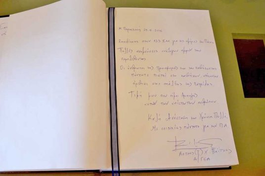 Το μήνυμά του στο βιβλίο επισκεπτών έχει ως εξής: