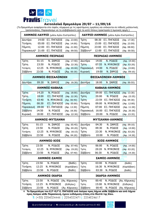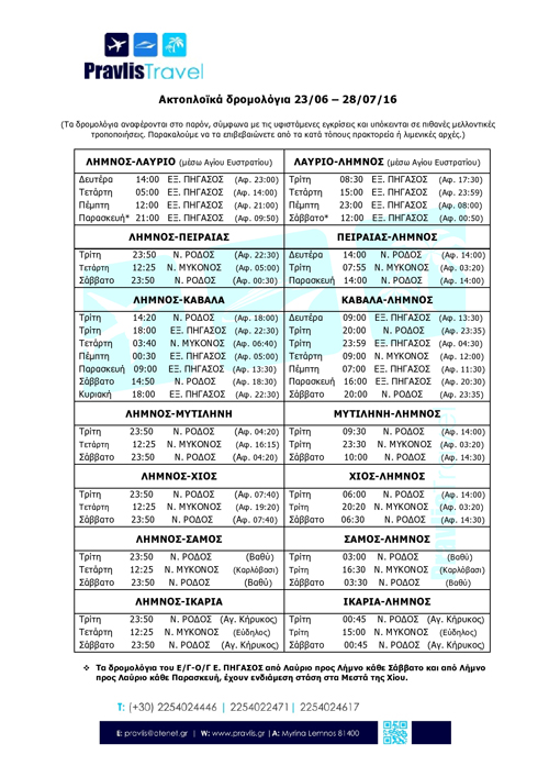 Όπως αναφέρει το ταξιδιωτικό πρακτορείο «Pravlis Travel», το πλοίο θα αναχωρεί από Λήμνο για Καβάλα κάθε Σάββατο στις 14:50 και όχι στις 14:20...