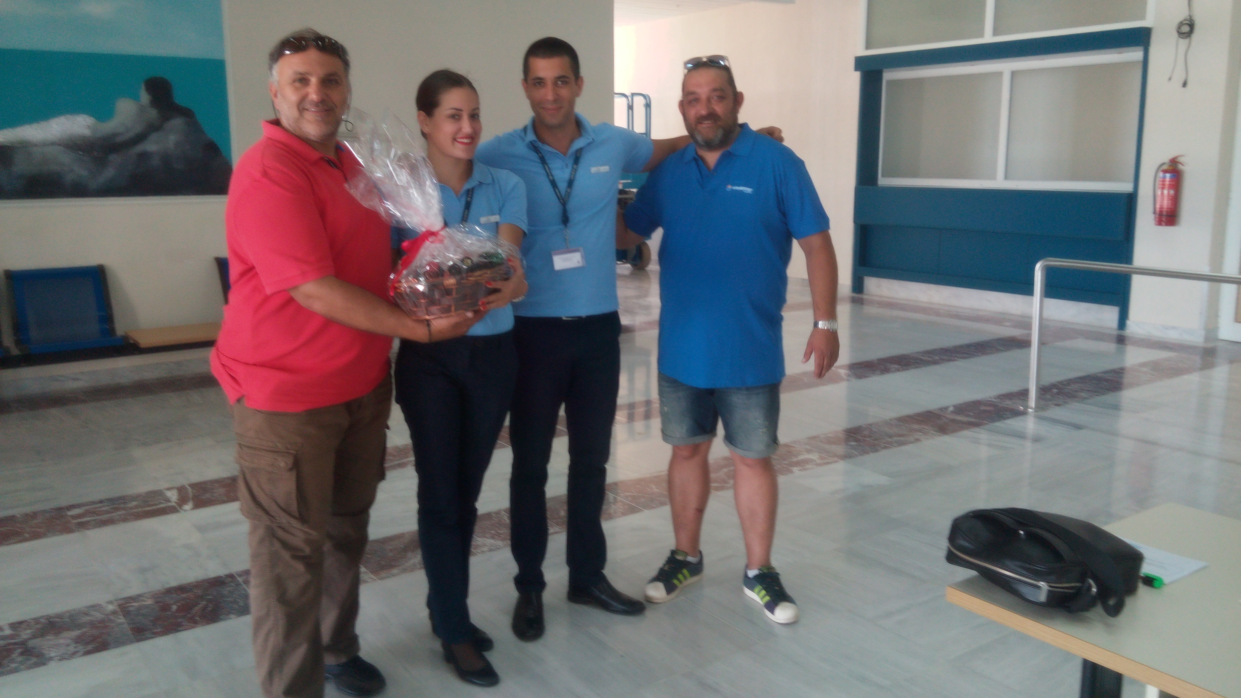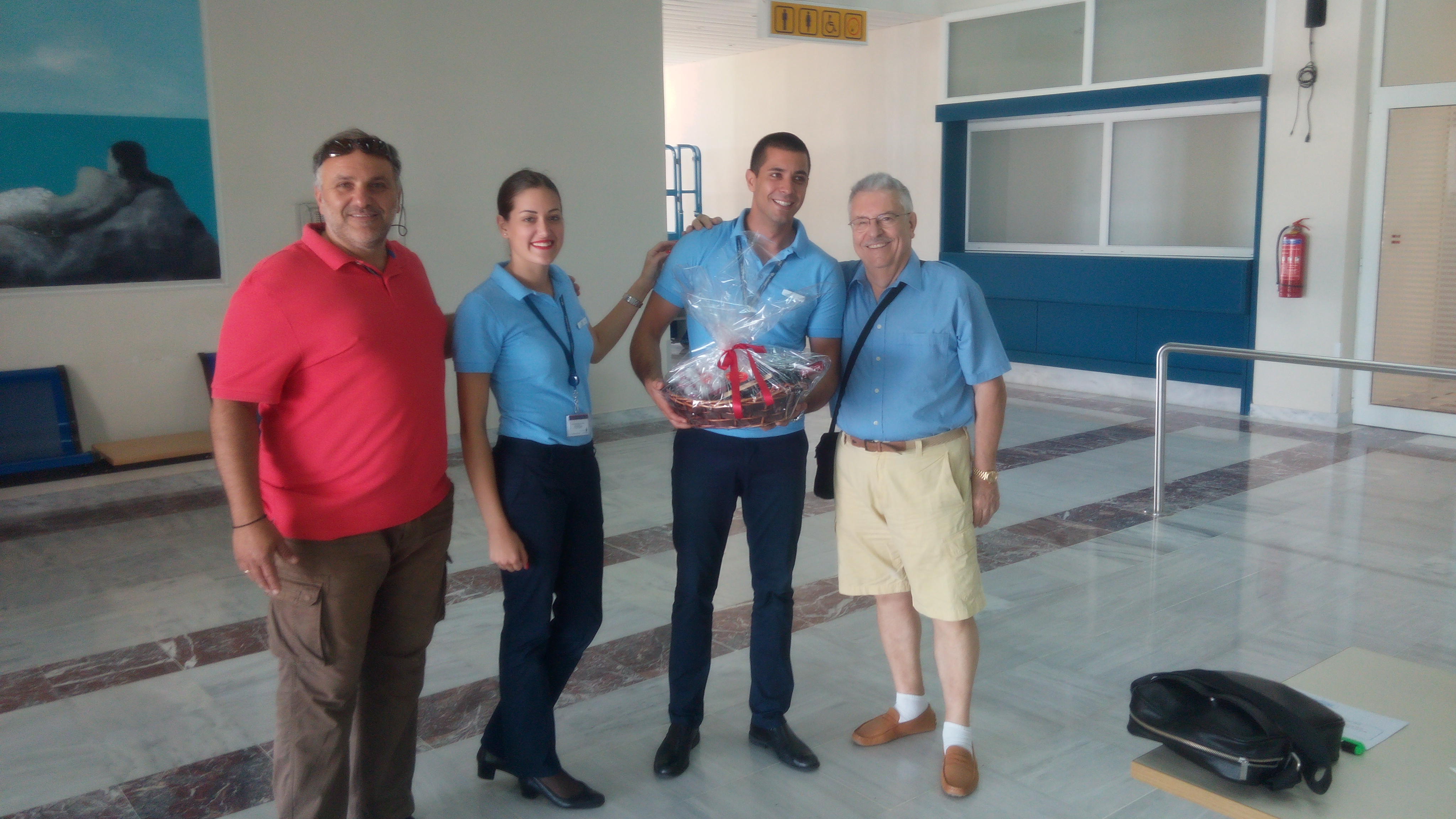 Τα μέλη της ΑΜΚΕ καλωσόρισαν τους 80 περίπου επιβάτες της πτήσης καθώς και το πλήρωμα του αεροσκάφους και τους προσέφεραν γλυκά και δώρα.