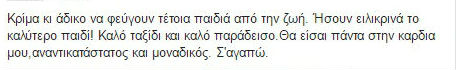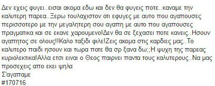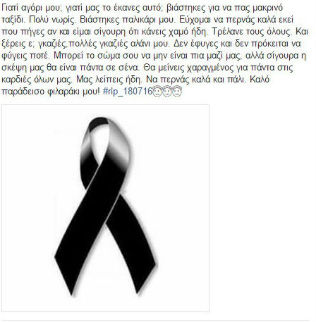 Αρκετοί θέλησαν να «μιλήσουν» στον άτυχο νέο και να του εκφράσουν για τελευταία φορά πώς νιώθουν. Να εκφράσουν τον πόνο και τη θλίψη που τους προκάλεσε η απώλεια του και το έκαναν, γράφοντας στον τοίχο του προσωπικού του προφίλ στο Facebook.