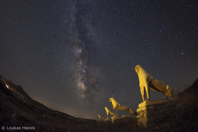 Από την έκθεση στο Ευγενίδειο «Ναοί στο Σχήμα του Ουρανού». Οι Λέοντες της Δήλου με milky way.
