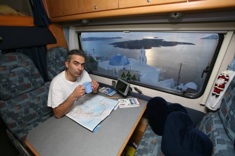Τα κριτήρια για να επιλέξει να διανυκτερεύσει κάπου (κατά τη διάρκεια της μέρας, συνήθως ταξιδεύει) δεν είναι ούτε η φυσική σκιά ούτε το προστατευμένο περιβάλλον, δηλαδή το οργανωμένο camping. «Επιλέγω το κάδρο» μου λέει, «δηλαδή αυτό που θα βλέπω από το παράθυρό μου. Θέλω να έχω το πιο ωραίο live view και δεν με νοιάζει αν το αυτοκινούμενο βρίσκεται στον ήλιο, αν γέρνει ή αν βρίσκεται στην άκρη του γκρεμού. Τα Χριστούγεννα ήμουν στη Σαντορίνη, άκρη άκρη στην καλντέρα και είχα τη συγκλονιστικότερη θέα».