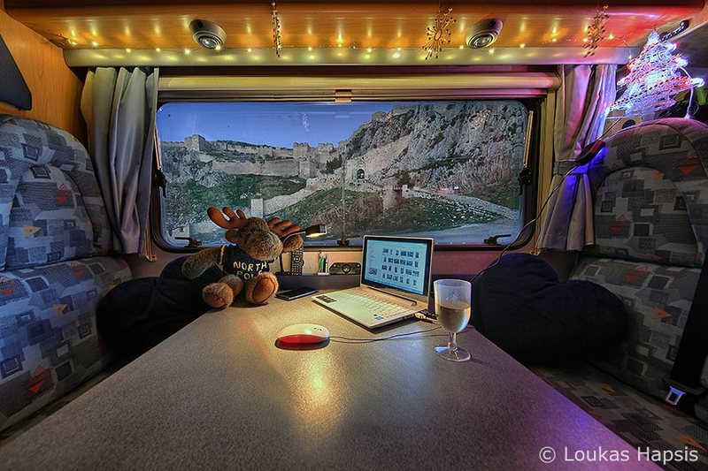 Το αυτοκινούμενο τελικά, όπως καταλαβαίνω από την κουβέντα, είναι ένα σπίτι σε μικρογραφία. Δεν του λείπει τίποτα, ούτε το ψυγείο ούτε η κουζίνα ούτε το ζεστό νερό. Ο Λουκάς μάλιστα, ειδήμων στην υπαίθρια ζωή, κουβαλά μαζί του εκτός από το φωτογραφικό εξοπλισμό και όλα εκείνα που αγαπά να κάνει στη φύση: από ποδήλατο και καγιάκ μέχρι snowboard, σκι και καταδυτικό εξοπλισμό. Τώρα τελευταία μάλιστα πρόσθεσε στην εξάρτυσή του και ένα drone και κάθε τρεις και λίγο μας τρελαίνει στο fb με τις ιπτάμενες λήψεις του, πότε στο Κάστρο της Λήμνου να μας χαιρετά μαζί με τα παιδιά του και πότε να «πετάει» μέσα στον ισθμό της Κορίνθου.