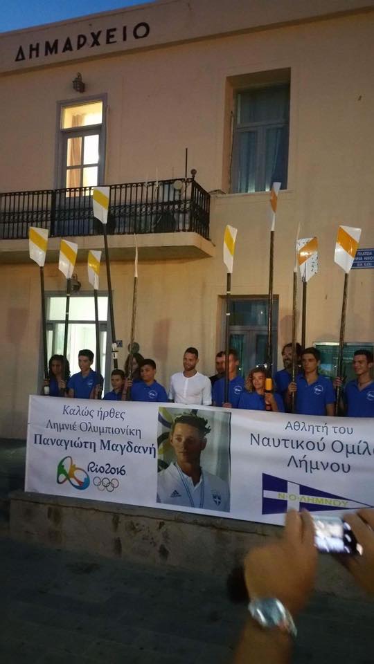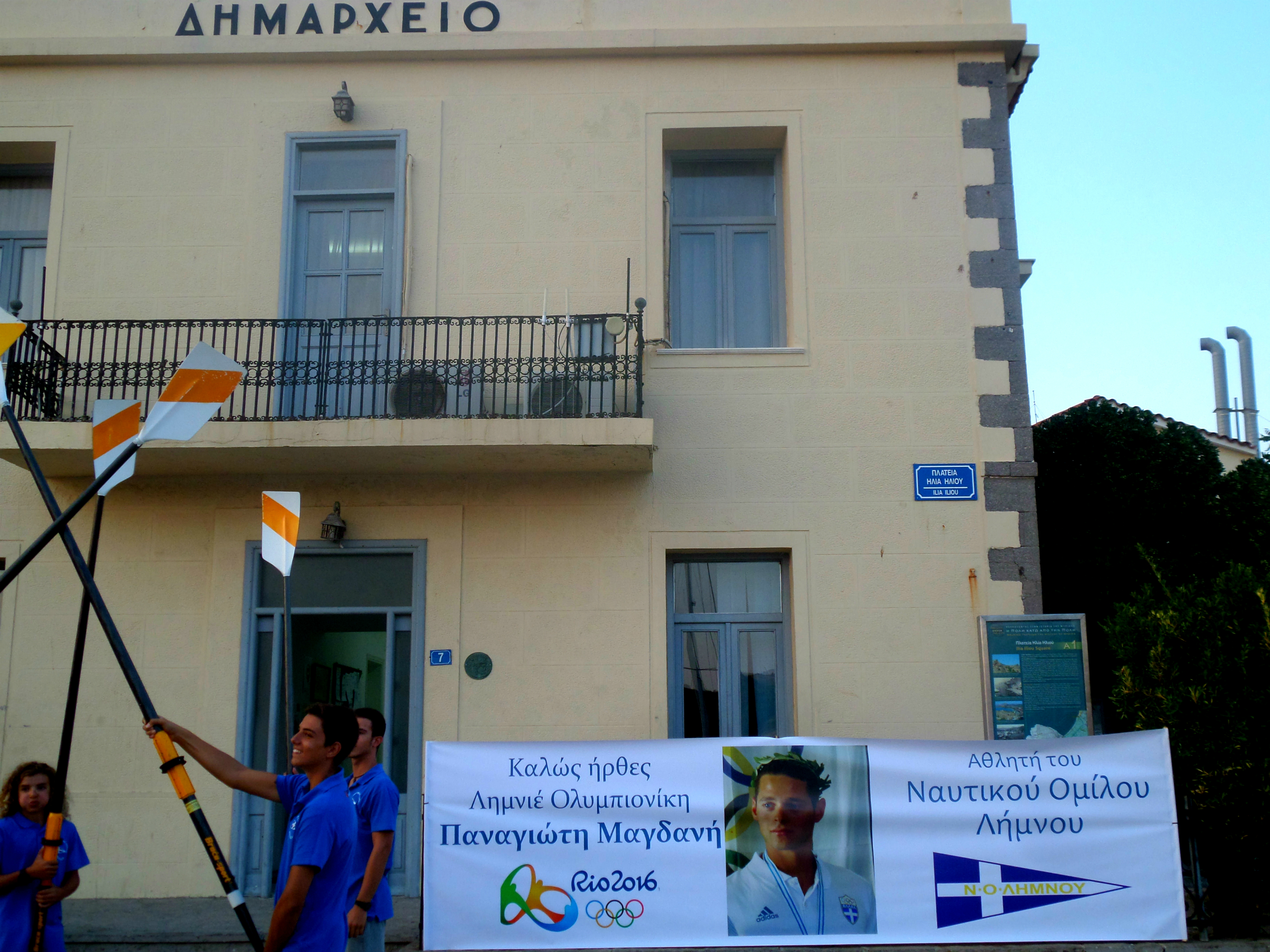 Ο Παναγιώτης Μαγδανής έφθασε στο Δημαρχείο συνοδευόμενος από τον συναθλητή του Γ. Χρήστου αργά το απόγευμα της Τετάρτης. Μπροστά στο Δημαρχείο είχαν παραταχθεί αθλητές του Ναυτικού Ομίλου Λήμνου, ενώ αρχικώς τους υποδέχθηκαν ο Αντιδήμαρχος κ. Νικόλαος Μοσχάκης και ο Πρόεδρος του ΟΕΠΑ Δήμου Λήμνου κ. Νικόλαος Μαρινάκης και εν συνεχεία ο Δήμαρχος στο γραφείο του.