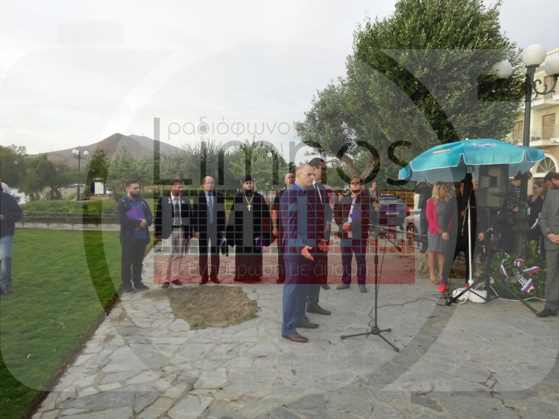 Ο κ. Μαυροθαλασσίτης μετέφερε το χαιρετισμό του Δημάρχου Λήμνου κ. Δημήτρη Μαρινάκη, ο οποίος βρίσκεται εκτός Λήμνου για υποθέσεις του Δήμου. Ο κ. Μαυροθαλασσίτης τόνισε ότι το νησί μας για 13η χρονιά «υποδέχεται τους αξιότιμους επισκέπτες μας από τη Ρωσία, σ’ ένα ταξίδι – προσκύνημα στους τάφους των προγόνων σας».