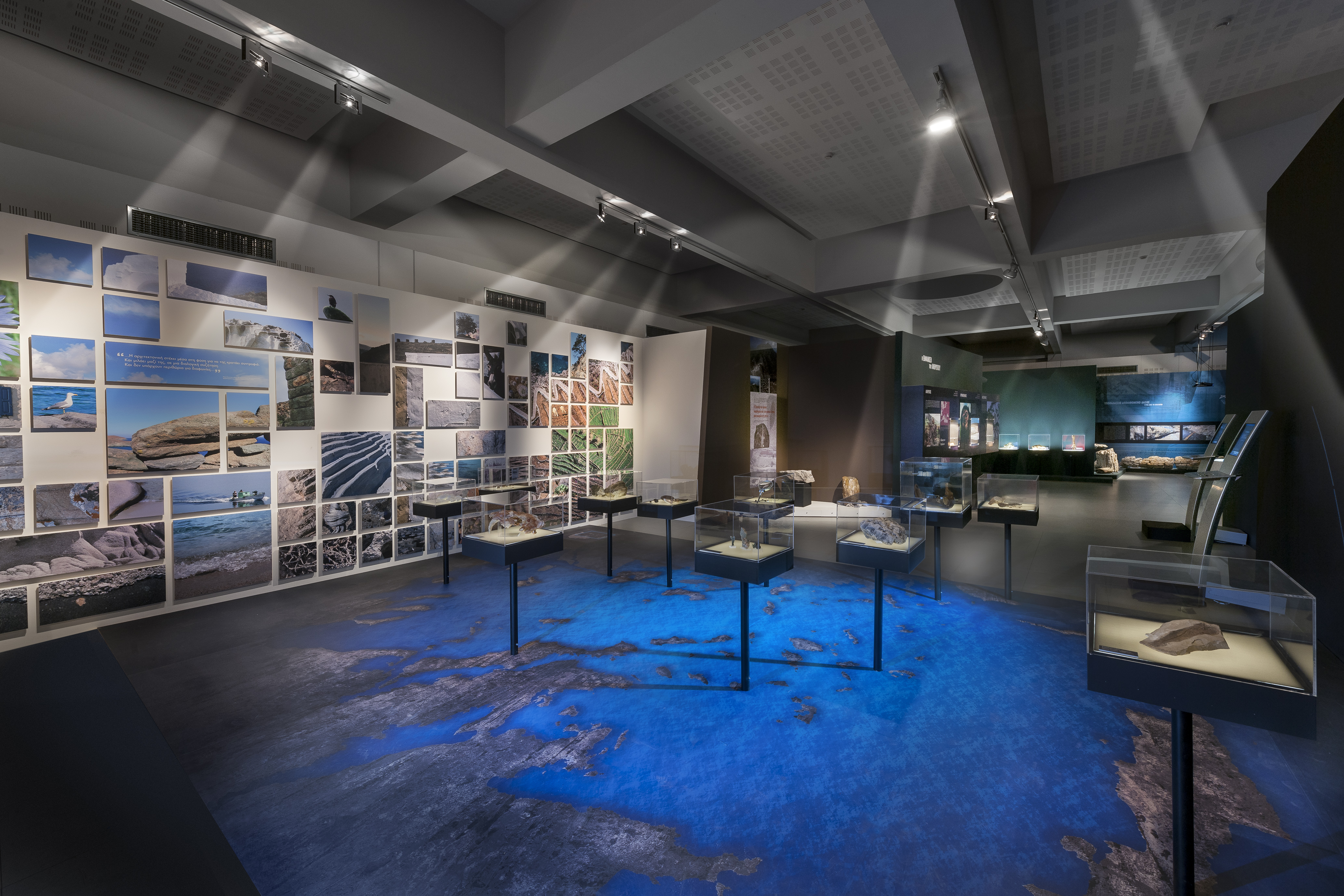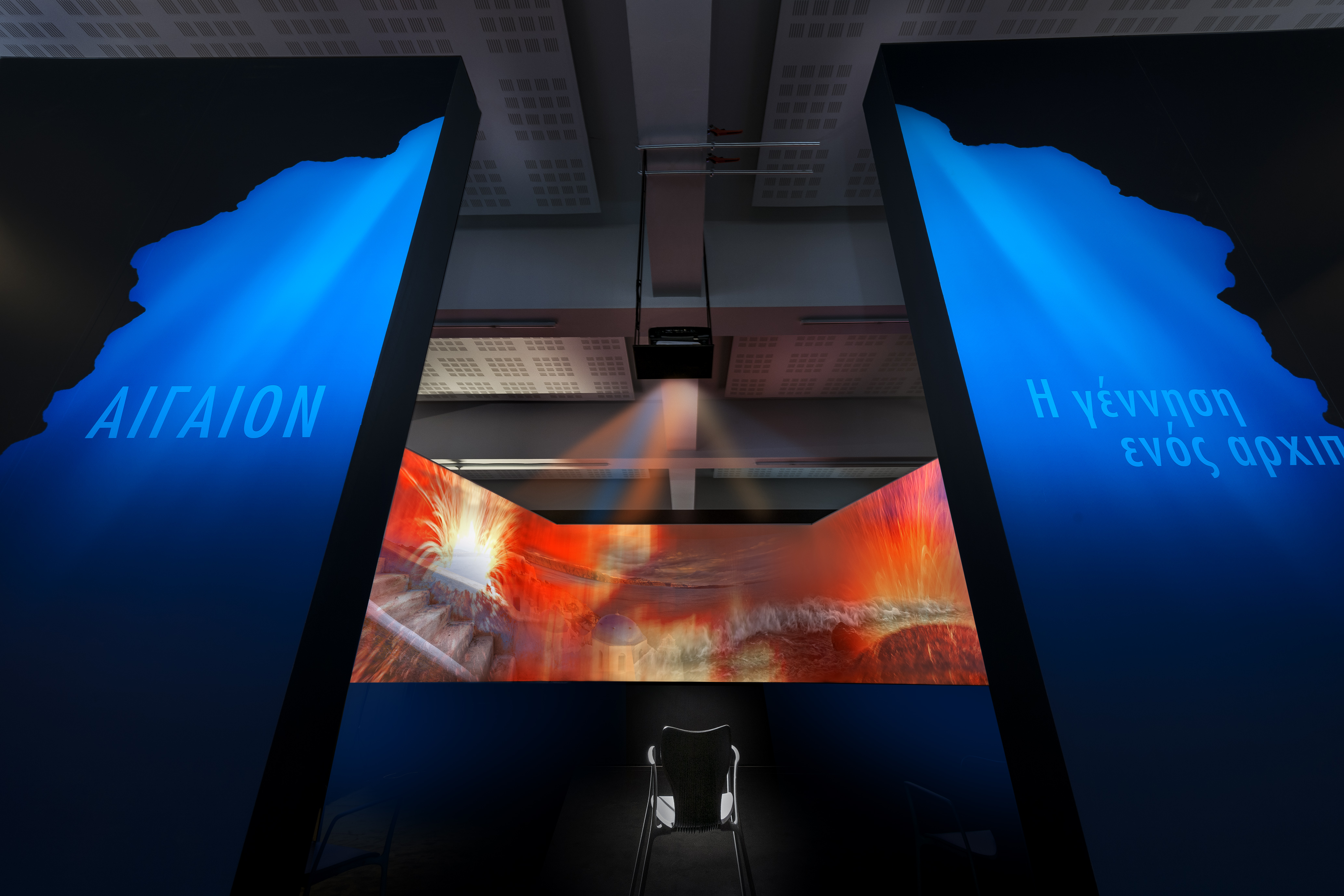 • «Στα νησιά του Ηφαίστου και του Ποσειδώνα». Το μεγαλύτερο μέρος του Αιγαίου χρωστά την ύπαρξή του στα ηφαίστεια, μερικά από τα οποία είναι ακόμα ενεργά, όπως αυτά της Σαντορίνης, της Νισύρου, της Μήλου και των Μεθάνων. Η δεύτερη ενότητα της έκθεσης παρουσιάζει τις γεωδυναμικές διεργασίες, την ηφαιστειότητα, τη σεισμικότητα και τις χθόνιες εκείνες δυνάμεις, που μέσα από συνεχή επανάληψη εκατομμυρίων ετών δημιούργησαν το ιστορικό αρχιπέλαγος.