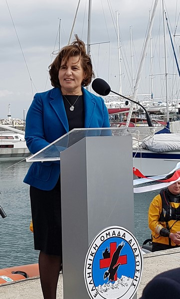 Νωρίτερα η κα Καλογήρου απηύθυνε σύντομο χαιρετισμό στην τελετή παράδοσης-παραλαβής δύο διασωστικών σκαφών από το Βασιλικό Εθνικό Ινστιτούτο Θαλάσσιας Διάσωσης (Royal National Lifeboat Institution) στην Ελληνική Ομάδα Διάσωσης, που πραγματοποιήθηκε στη μαρίνα της Μυτιλήνης παρουσία της πρέσβειρας της Μεγάλης Βρετανίας, όπου μεταξύ άλλων τόνισε: «Η θαλάσσια έρευνα και διάσωση συνοδεύεται από μεγάλα προβλήματα, είναι πάντα ένα κατόρθωμα και πάντα ένας άθλος και μόνο όσοι έχουν εμπειρία μπορούν να αντιληφθούν το εύρος και τη σημασία της προσφοράς της Ελληνικής Ομάδας Διάσωσης.