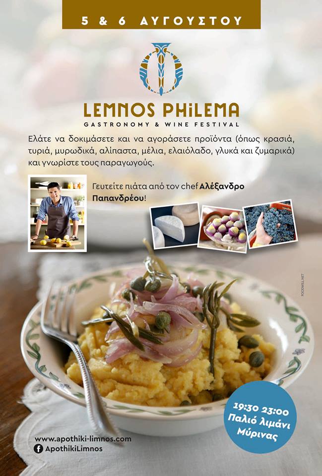 Το φεστιβάλ που φιλοξενείται στον πολυχώρο «Αποθήκη», στο παλιό λιμάνι της Μύρινας, άνοιξε εχθές 5 Αυγούστου τις πόρτες του και σας περιμένει και σήμερα 6 Αυγούστου, με κεντρικό στοιχείο τα τρόφιμα και τους οίνους που παράγονται στο νησί της Λήμνου.