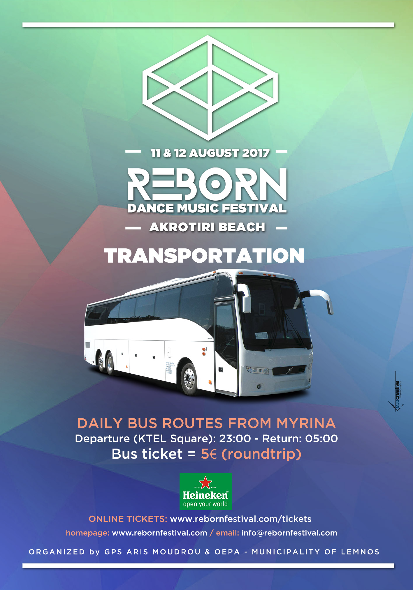 Φέτος η διοργάνωση του φεστιβάλ δίνει την δυνατότητα μεταφοράς του κοινού από την Μύρινα μέσω γραμμής λεωφορείου και για τις δύο ημέρες. Το λεωφορείο θα αναχωρεί στις 23:00 από την πλατεία των ΚΤΕΛ με προορισμό το φεστιβάλ και θα ξεκινάει το δρομολόγιο της επιστροφής προς την Μύρινα στις 5 το πρωί. Το κόστος μεταφοράς θα είναι 5 ευρώ (με επιστροφή)