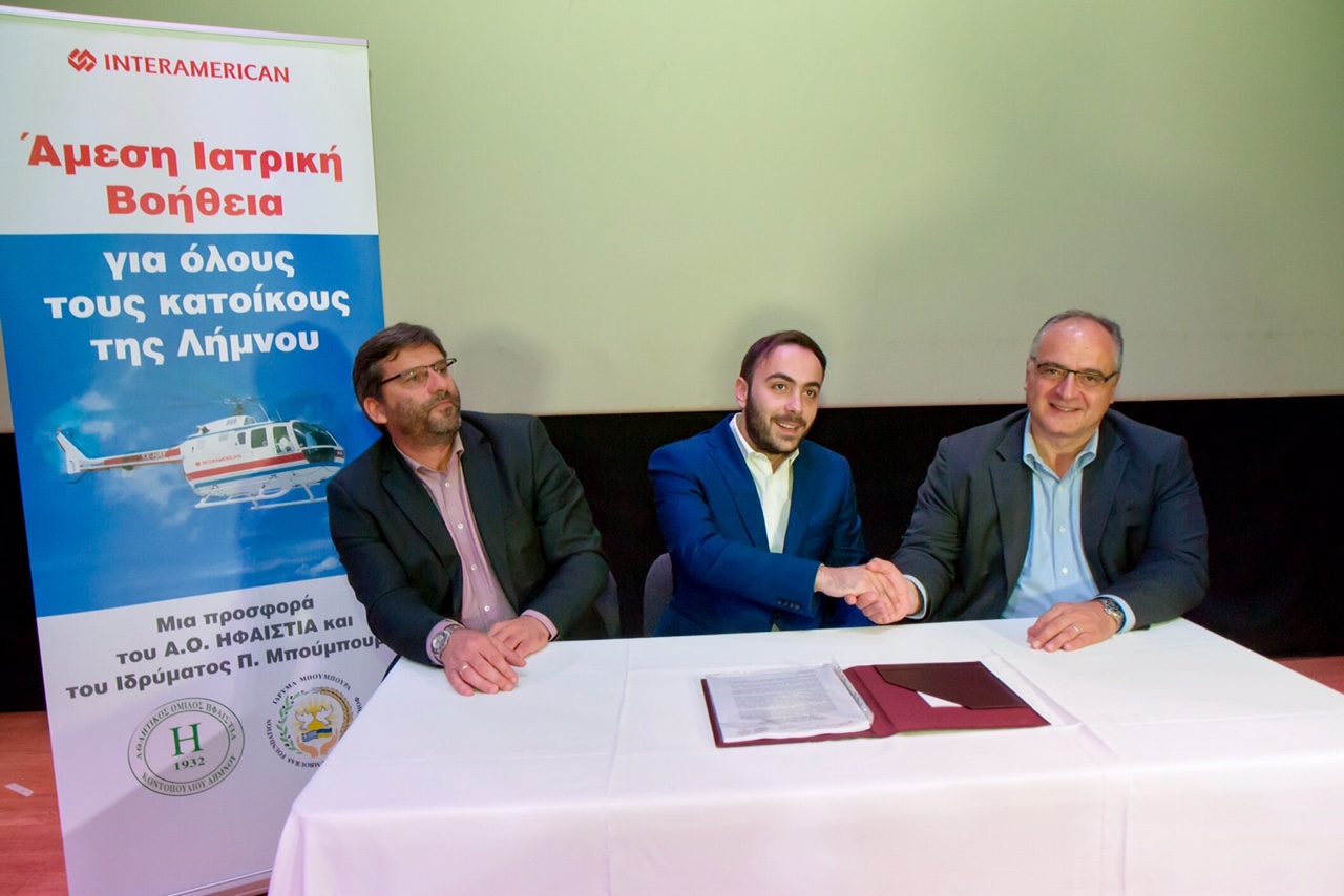 Ο Αντιπρόεδρος του «Ιδρύματος Μπούμπουρα», Σπύρος Μπούμπουρας, υπέγραψε την Τετάρτη 22 Νοεμβρίου, το συμβόλαιο ασφάλισης υγείας όλων των κατοίκων της Λήμνου και την αερομεταφορά ασθενών σε περίπτωση ανάγκης, με την Ασφαλιστική Εταιρία Interamerican.