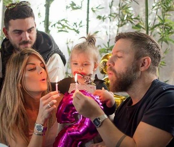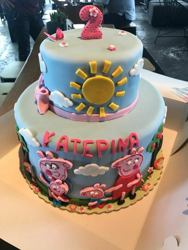 Η τούρτα με τα δύο κεράκια ήταν σε γαλάζιο χρώμα αφού είναι το αγαπημένο χρώμα της μικρής και διακοσμημένη με την Πέππα το γουρουνάκι το αγαπημένο της καρτούν και όπως ήταν επόμενο έκλεψε τις εντυπώσεις και τα χαμόγελα της Κατερίνας.