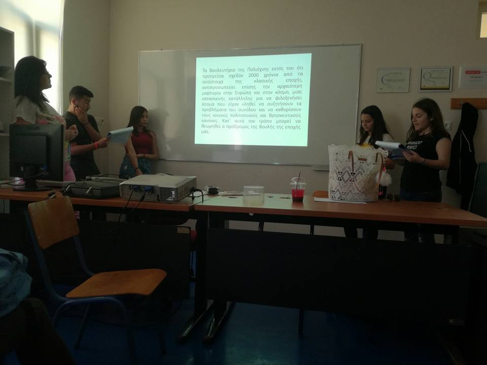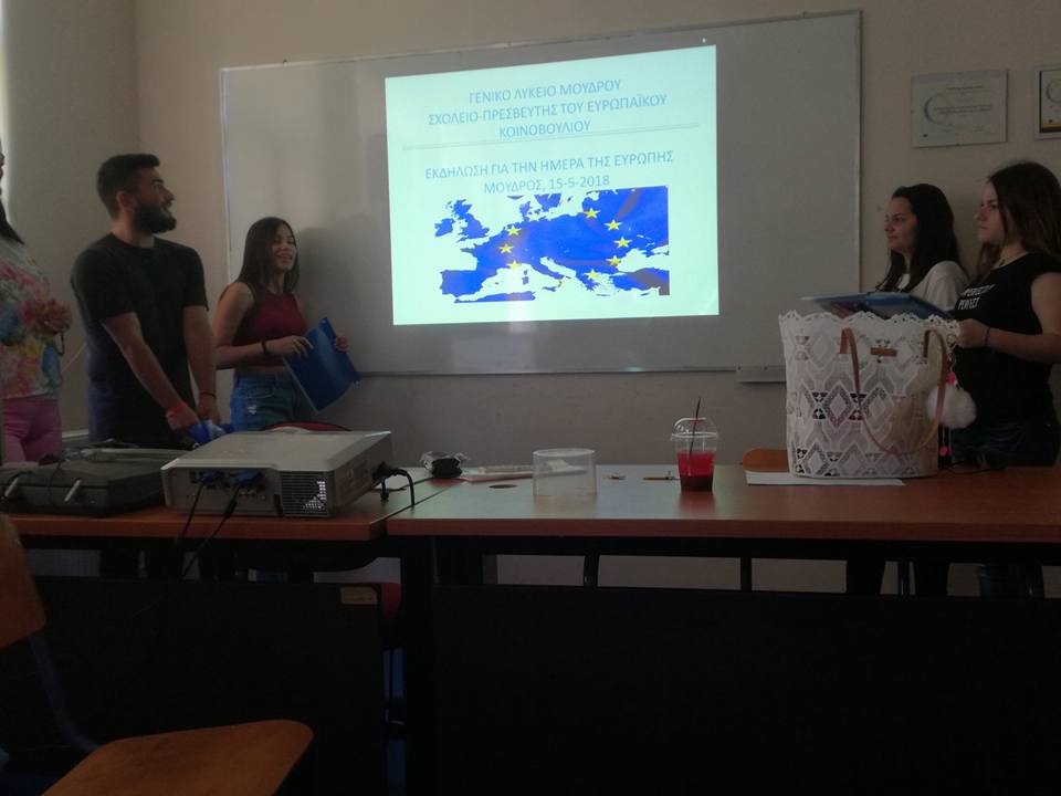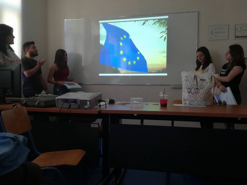 Στη συνέχεια οι μαθητές και των τριών τάξεων του σχολείου παρακολούθησαν ενημερωτικά βίντεο για τον Ύμνο της Ευρωπαϊκής Ένωσης, τις σημαίες των χωρών της Ε.Ε., για το πρόγραμμα Erasmus+, τον εθελοντισμό, την πολιτική της Ένωσης για το προσφυγικό, την κατάργηση των κοινωνικών διακρίσεων, την κυκλική οικονομία, για την προστασία των καταναλωτών, το Ευρώ και την κατάργηση του τέλους περιαγωγής (roaming) που έχει εφαρμοστεί από τον Ιούνιο του 2017.