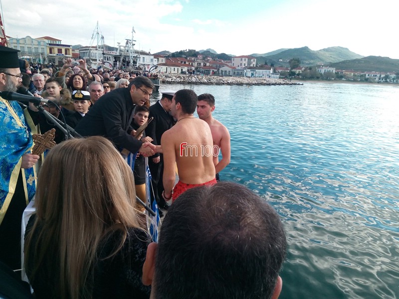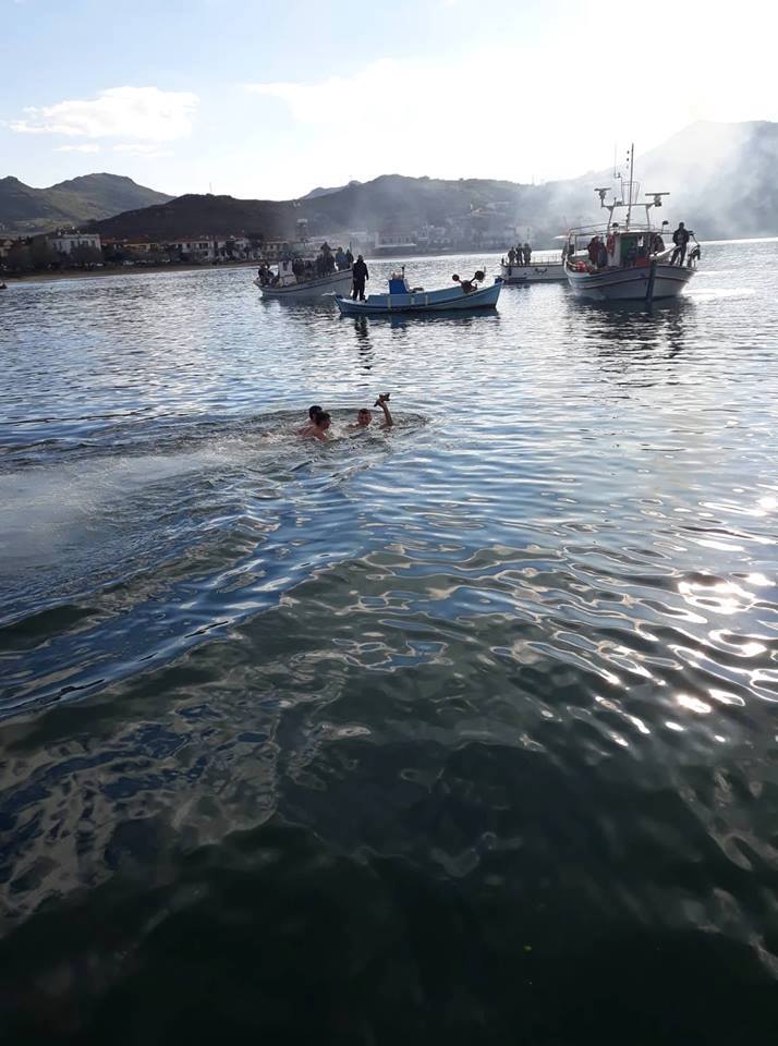 Ο Αγιασμός των Υδάτων και η ρίψη του Τιμίου Σταυρού ξεκίνησαν στις 11 το πρωί χοροστατούντος του πατέρα Αντώνιου ο οποίος μετέφερε το μήνυμα του Μητροπολίτη Λήμνου κ. Ιερόθεου για καλή χρονιά.