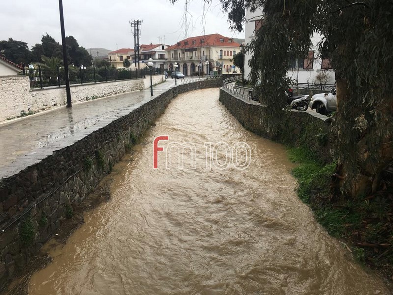 Τα έντονα καιρικά φαινόμενα είχαν ως αποτέλεσμα οι δρόμοι να μετατραπούν σε ποτάμια ενώ «φούσκωσε» το ποτάμι στην Αγία Τριάδα της Μύρινας.