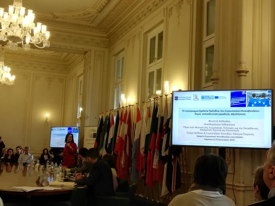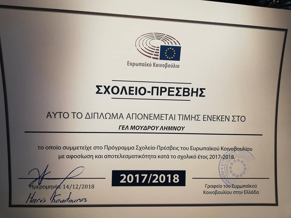 Τόσο ο υπεύθυνος δημοσίων σχέσεων του Γραφείου κ. Χάρης Κούντουρος όσο και η αναπληρώτρια καθηγήτρια του Τμήματος Διεθνών και Ευρωπαϊκών Σπουδών του Πανεπιστημίου Πειραιώς κ. Φωτεινή Ασδεράκη τόνισαν τις σημαντικές δράσεις που ανέλαβε και υλοποίησε το Γενικό Λύκειο Μούδρου στο πλαίσιο του προγράμματος "Σχολεία πρέσβεις του Ευρωπαϊκού Κοινοβουλίου", με ιδιαίτερη έμφαση στην προβολή του αρχαιότερου κοινοβουλίου στον κόσμο στον αρχαιολογικό χώρο της Πολιόχνης, μέσα από το βίντεο που υλοποιήθηκε σε τέσσερις γλώσσες (ελληνική, αγγλική, γαλλική και γερμανική).