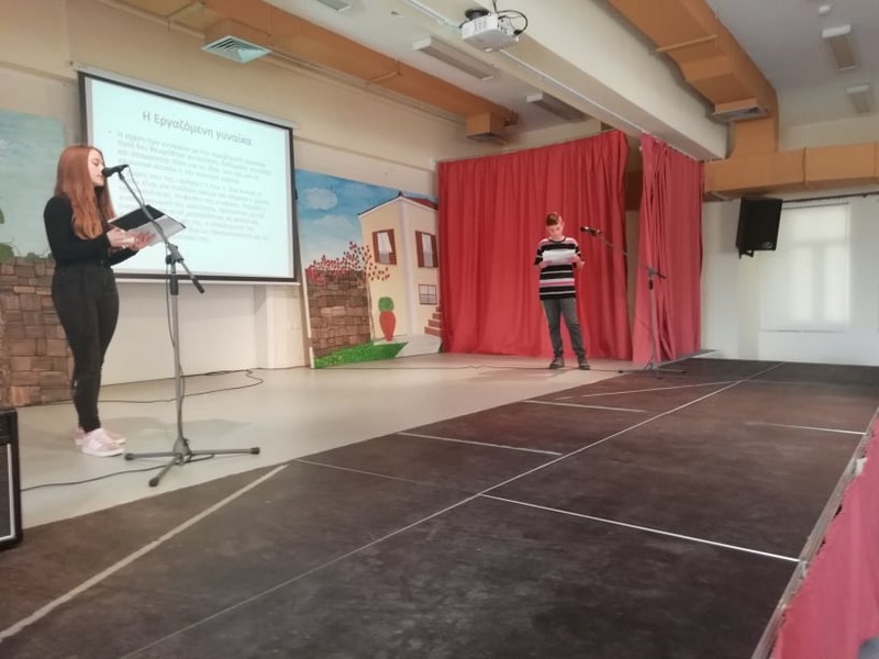 Στη συνέχεια, το Γυμνάσιο και το Λύκειο Μούδρου συμπαρουσίασαν αφιερώματα στους πολλαπλούς ρόλους της γυναίκας: τη γυναίκα στη θρησκεία, στην τέχνη, στην επιστήμη, στην εργασία, στην πολιτική, στο Ευρωκοινοβούλιο. Η εκδήλωση πλαισιώθηκε με μουσική και τραγούδι από τη χορωδία του Γυμνασίου.